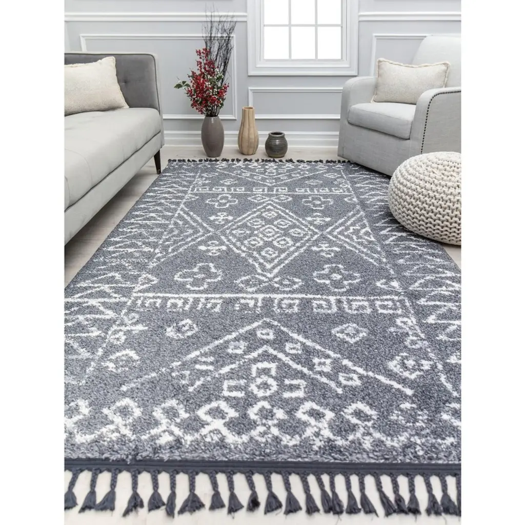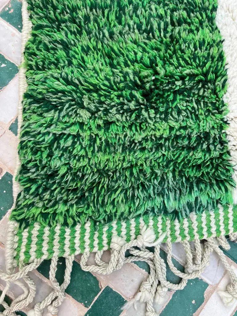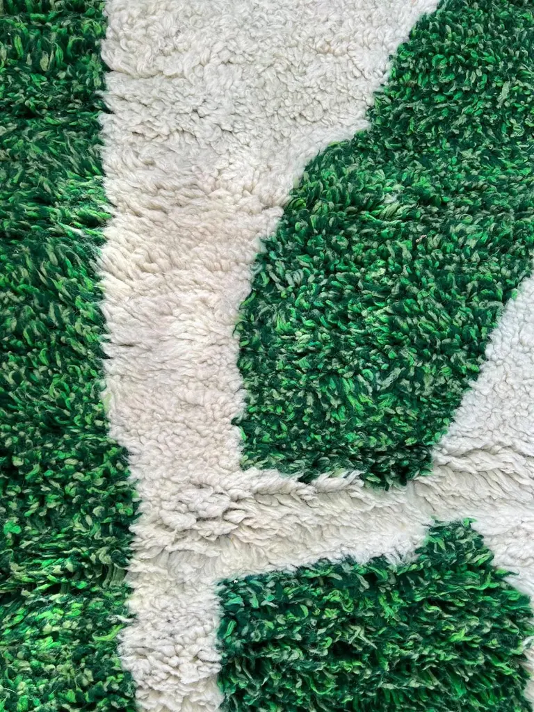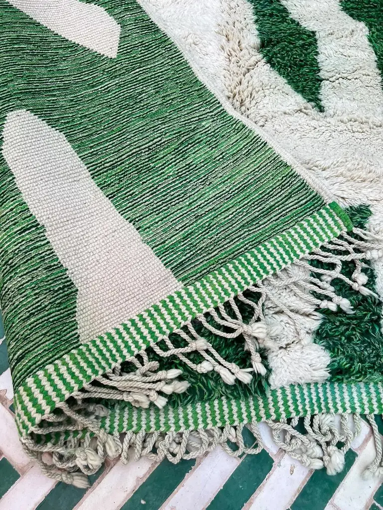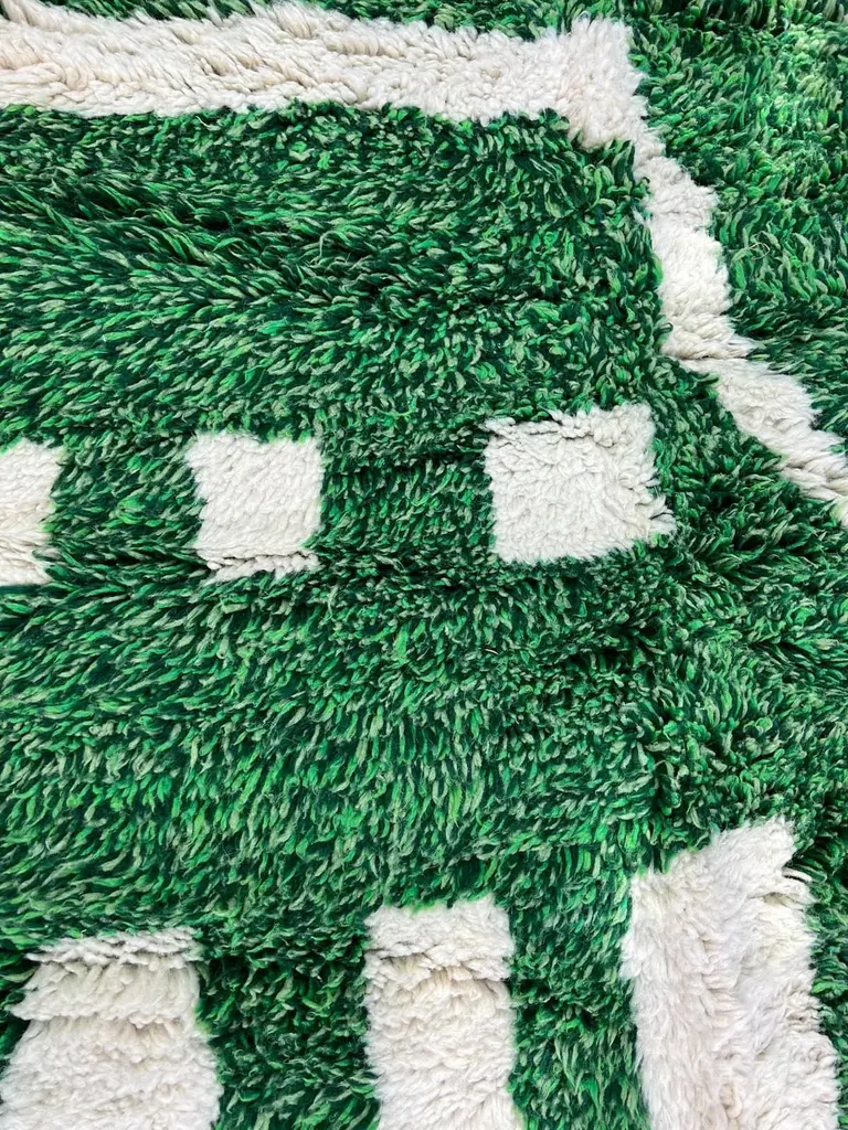 This large green handwoven Moroccan rug was made by hand by skilled artisans in the Atlas Mountains using the highest quality M'Rirt wool. It is impressive in both size and design, and is the perfect luxury statement piece for any room. The base of this carpet is a rich, vibrant green color and it features an abstract cream colored tribal design. The 100% high quality wool construction makes for a very soft feel underfoot. This rug measures approximately 10'1" x 14".