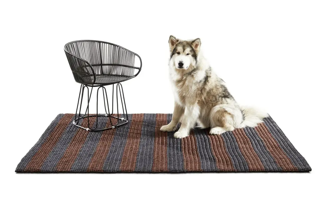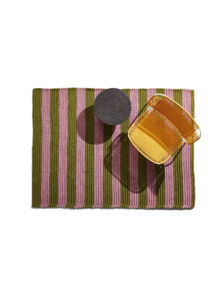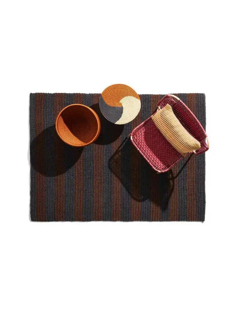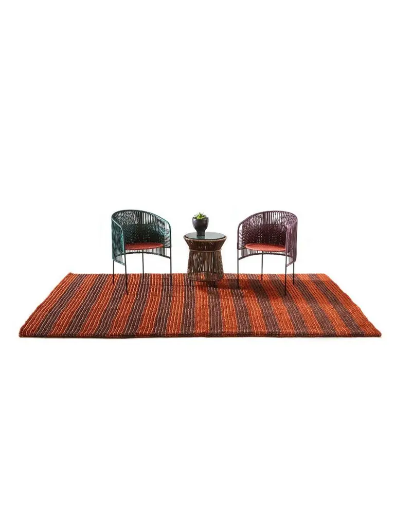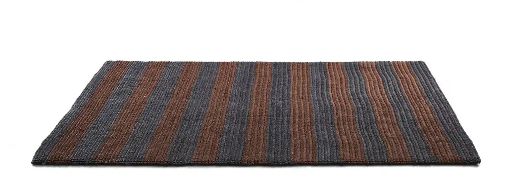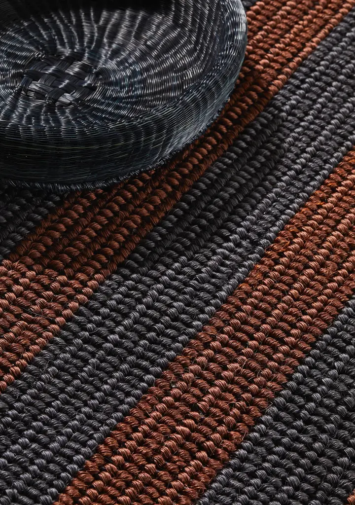 Large Par Raya rug by Sebastian HerknerMaterials: Fibres from Jipi palm leaves fibres. Technique: Naturally dyed fibers. Hand-woven in Colombia.Dimensions: W 310 x L 420 cm Available in colors: cbrownish purple/ rust, flax/ kurkuma, black/ brownish purple, olive green/ dark flax, pink/ fresh green.Subtle color combinations and a play with contrasts characterize the Par Raya Rug by Sebastian Herkner. The color range for the stripe pattern mirrors the earthy, warm tones the designer saw when he visited the Huila region in Colombia. The rug is knotted with fibers that come from the leaves of the fique plant, a wild-growing agave-like tree. The rug is available in five different color combinations and in three sizes. Each rug is knotted in small ateliers in the Santander region. The yarns are made up of 28 individual fibers, which are prepared in an elaborate process that takes seven days, which includes washing the leaves and soaking them for 15 hours before they are dried and brushed by hand. These hardwearing, long fibers have even flame retardant qualities. Then it takes one experienced artesano 20 days to make the actual rug, setting the knot next to the knot on a vertical loom. German designer Sebastian Herkner is a long-term collaborator of Ames and has visited Colombia multiple times to experience the country’s cities, nature and people first hand. He also visited many of the ateliers that Ames has partnered with to learn about the unique traditional crafts of Colombia's regions. A sought-after contemporary designer and recipient of many industry awards, he has worked with many international design brands, creating intriguing pieces that showcase his intuition for interesting material, color, and texture combinations.