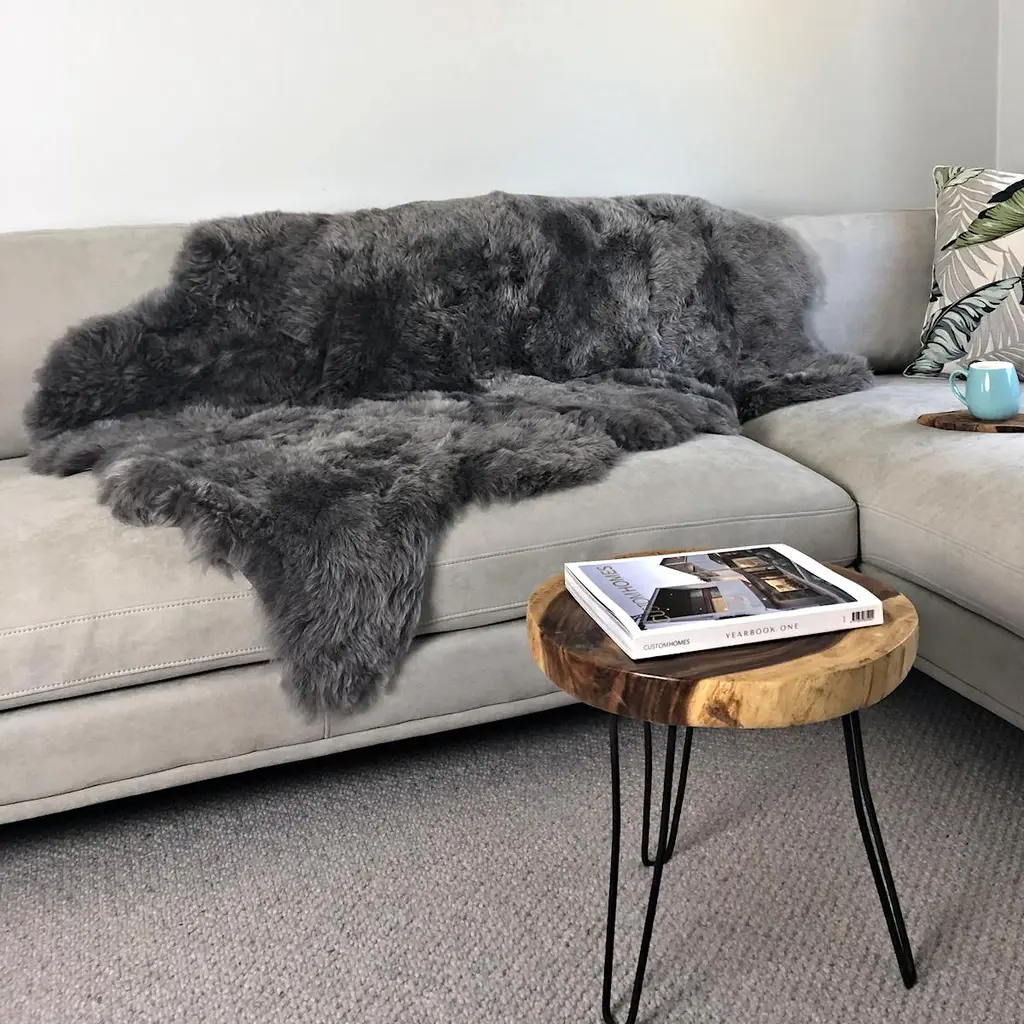 This large sheepskin throw rug will create an atmosphere of stylish design and luxurious comfort, handcrafted from the finest quality short wool Icelandic Sheepskin. This charming and endearing grey sheepskin throw rug expresses the beauty of natural and sustainable living bringing signature styling to both Classic and modern interiors suitable for the styling of a sofa, bed or flooring.Each sheepskin throw rug is crafted in Australia by eluxury home, using individual and carefully sourced Icelandic sheepskins creating distinguished and organic curved edges formed by the natural shape of each sheepskin used. Eco-tanned and eco-friendly sheepskins from Europe resulting in a natural product with no harsh and toxic chemical processing resulting in soft skins that drape effortlessly with high-quality wool for every day living.Fashion dyed, in a grey short wool with a wool pile of approximately 1.5". This large sheepskin throw rug comes unlined with the natural sheepskin leather and stitching exposed. Eluxury home are Artisans in sheepskin home decor while offering custom design and make service in any size and color to assist you on your next design project.Features:Color: GreyDimensions: 100 x 145cm (furthest points)Wool pile: up to 4cmMade in AustraliaEco-tanned / eco-friendly sheepskinsNatural by productSuitable for bed, sofa or flooringProduct care:Vacuum on low setting.Spot clean only with clean lukewarm water and gentle wool wash. Do not submerge into water or wash. Do not apply chemical agents to the wool.Brush with wired pet brush.Dry clean only. Do not steam clean. Non slip grip highly recommended if used for flooring.Keep away from direct sunlight to prevent color fadingColor swatch:Sheepskin color swatches are available upon request.
