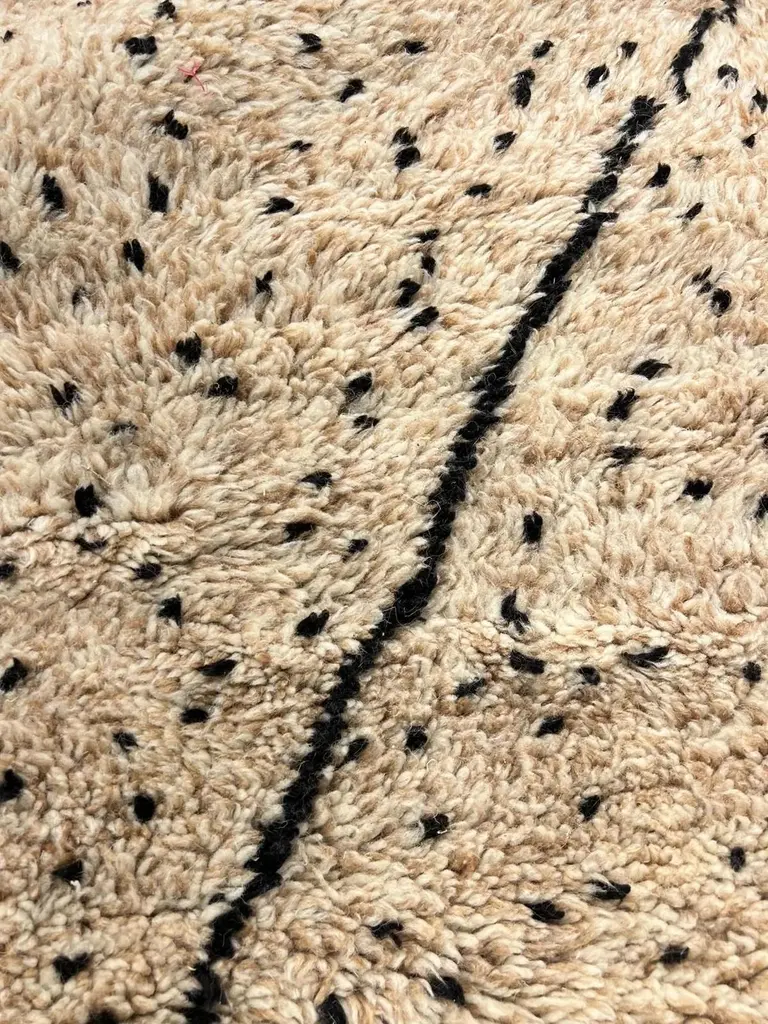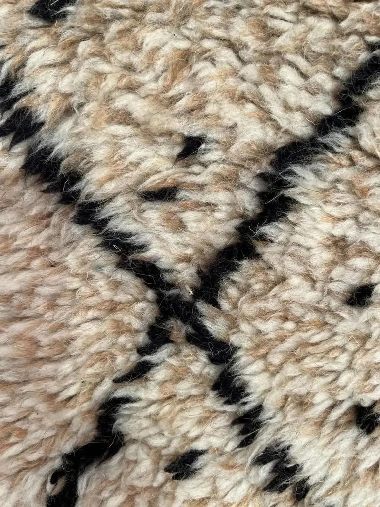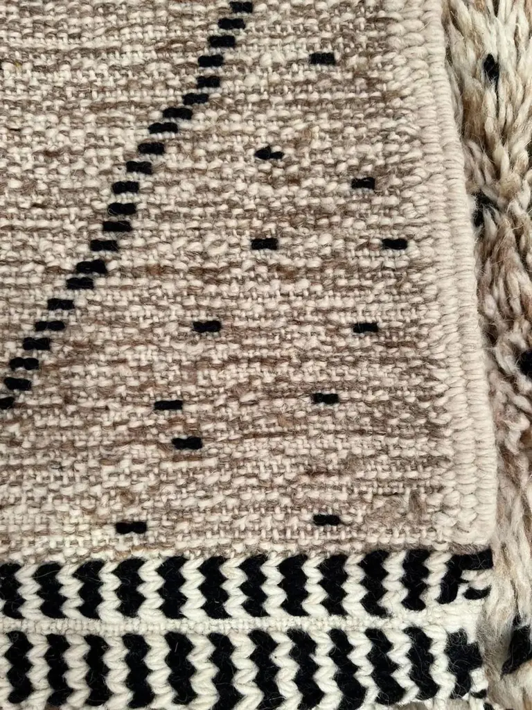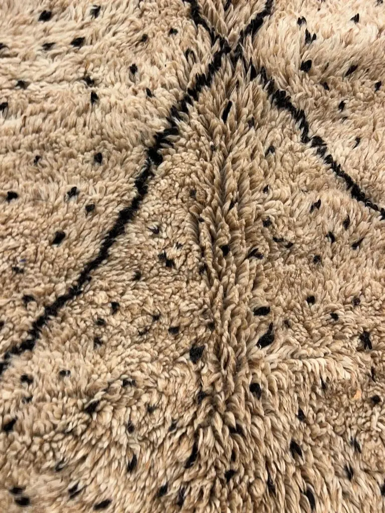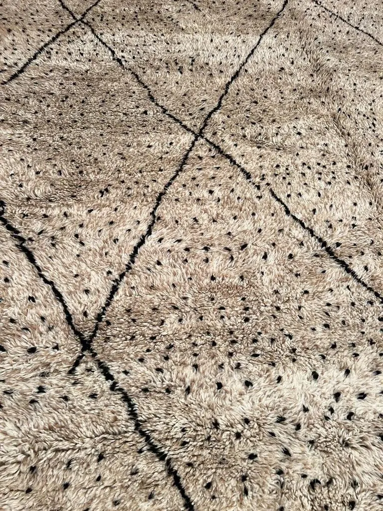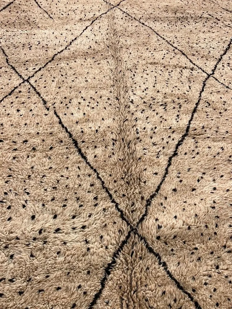 This large taupe neutral handwoven Moroccan rug was made by hand by skilled artisans in the Atlas Mountains using the highest quality M'Rirt wool. It is impressive in both size and design, and is the perfect luxury statement piece for any room. A heathered brown and cream wool base forms the background for a classic abstract Moroccan line design in black wool. This rug measures approximately 10'1" x 13'9" feet and is the ideal anchor for bedroom, living room, or any other large space. The 100% high quality Moroccan wool construction makes for a very soft and luxurious feel underfoot. A long pile adds to ultra soft luxury feel.