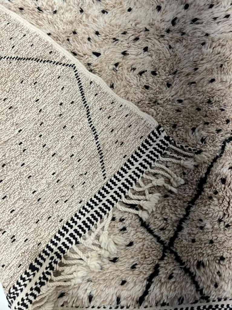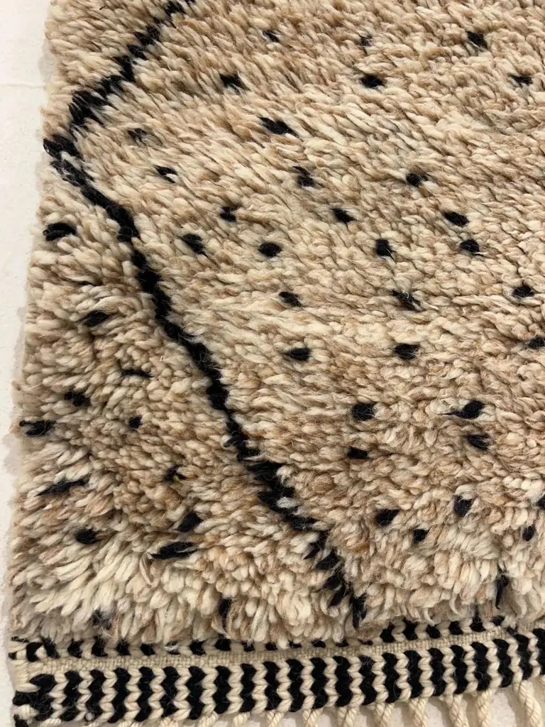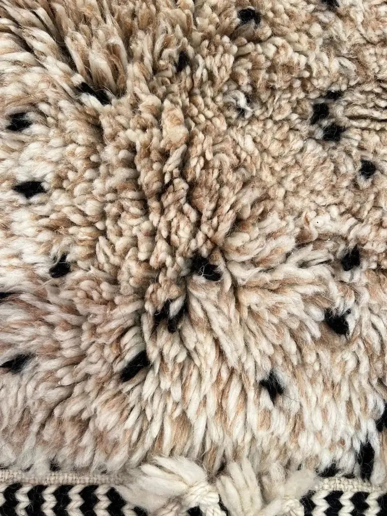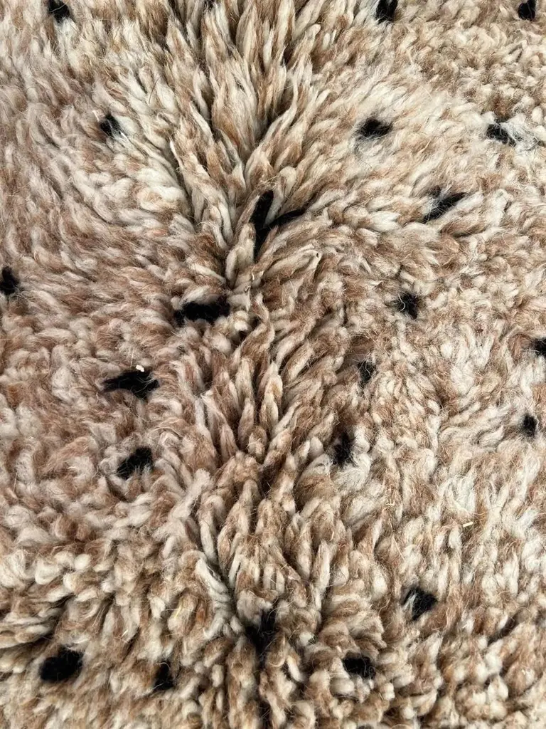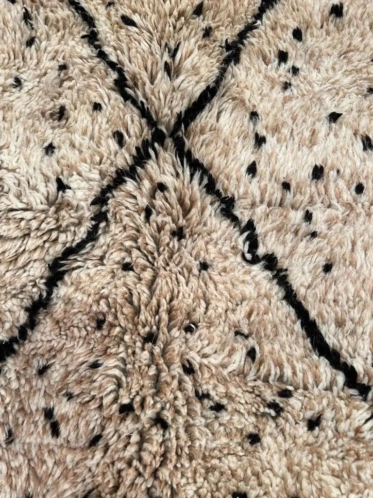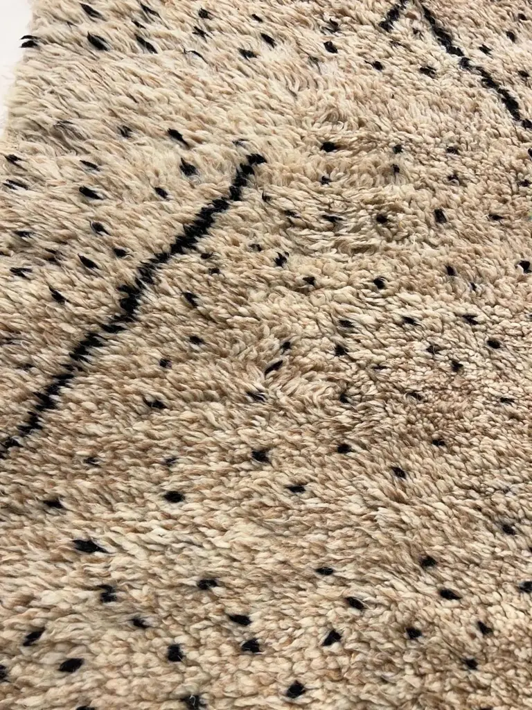 This large taupe neutral handwoven Moroccan rug was made by hand by skilled artisans in the Atlas Mountains using the highest quality M'Rirt wool. It is impressive in both size and design, and is the perfect luxury statement piece for any room. A heathered brown and cream wool base forms the background for a classic abstract Moroccan line design in black wool. This rug measures approximately 10'1" x 13'9" feet and is the ideal anchor for bedroom, living room, or any other large space. The 100% high quality Moroccan wool construction makes for a very soft and luxurious feel underfoot. A long pile adds to ultra soft luxury feel.