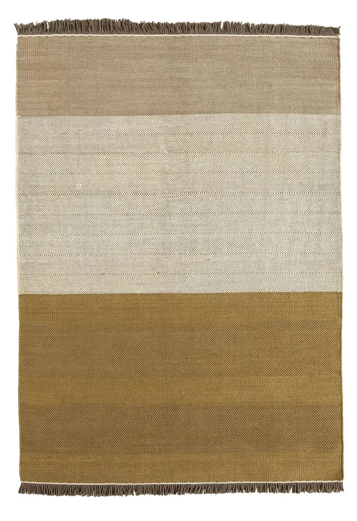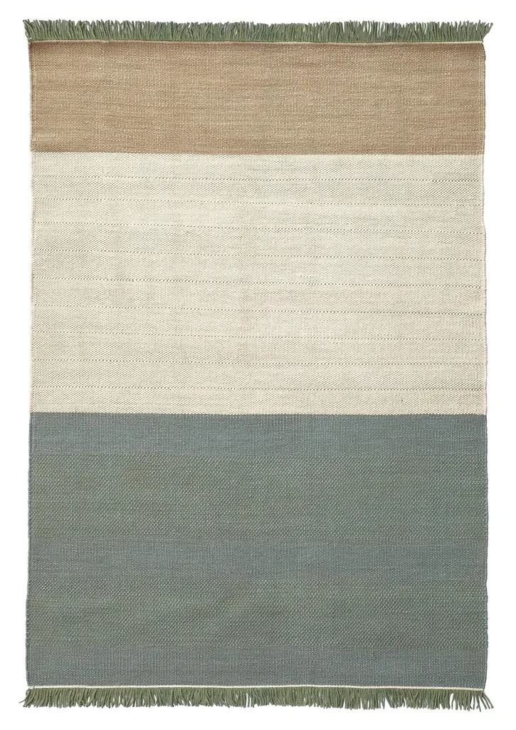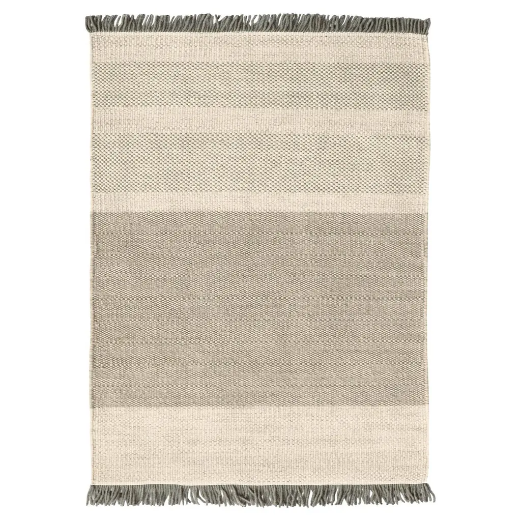 Large 'Tres Stripes' Hand-Loomed rug for Nanimarquina.Fabricated from a natural blend of New Zealand wool, felt, and cotton, 'Tres' is a traditional Indian flat-weave Dhurrie rug. Its unique quality lies in the production of three independent parts in which the different fibers are allowed to shine. The commingling of the three materials highlight subtle changes in tone and irregularities in the weave, bringing the handmade nature of this pattern brilliantly to life.Nani Marquina founded her namesake company in 1987 in Barcelona. More than 30 years later, the company continues to offer artisanal rugs worldwide without compromising on design, quality, or aesthetics. Each rug is crafted with respect for the environment, with outdoor rugs made from 100% recycled PET in an innovative process that reduces up to 70% of water waste.Price is per item. Available in unlimited quantities in five standard sizes and in choice of black, blue, salvia, ochre, green, chocolate and pearl. This listing is for the large-sized rug; please specify color when ordering.Custom sizes available upon request for an additional fee and with extended lead times possible.In-stock lead time 11-12 weeks. Out of stock or custom sizing can add additional 14 weeks or more. Inventory availability subject to change at any time. For time-sensitive orders, please inquire prior to purchasing.Please note that due to the organic and handmade nature of this fiber some variation in color may occur from piece to piece, which may become further pronounced with prolonged exposure to sunlight. Only one representative example of the rugs is shown in the images.Also note this item must ship directly from Nanimarquina’s fulfillment center, so 1st Dibs arranged shipping and local pick-up are not an option. Shipping cost quoted is per item and cannot be combined.Hand made to order. All sales are final.