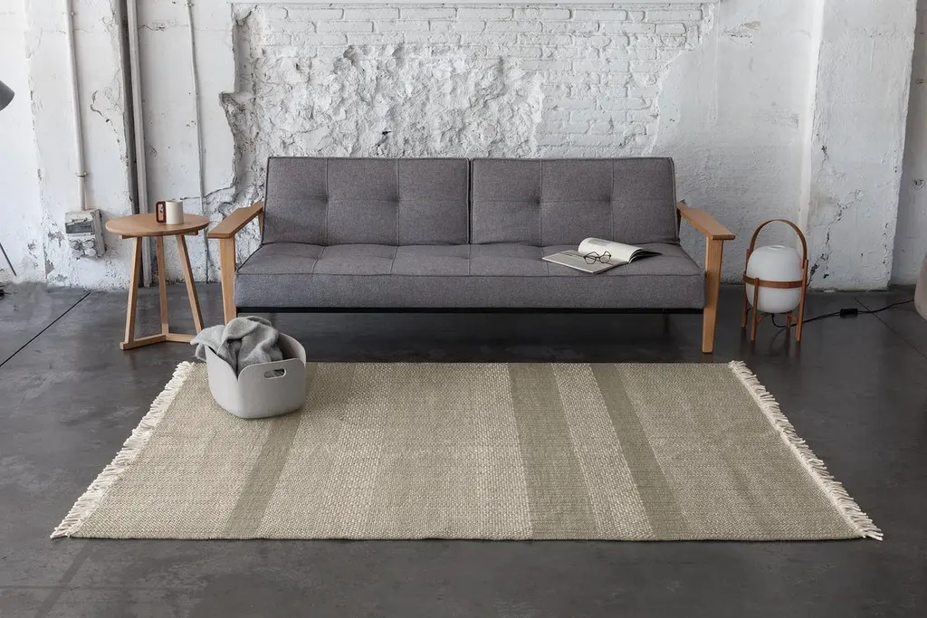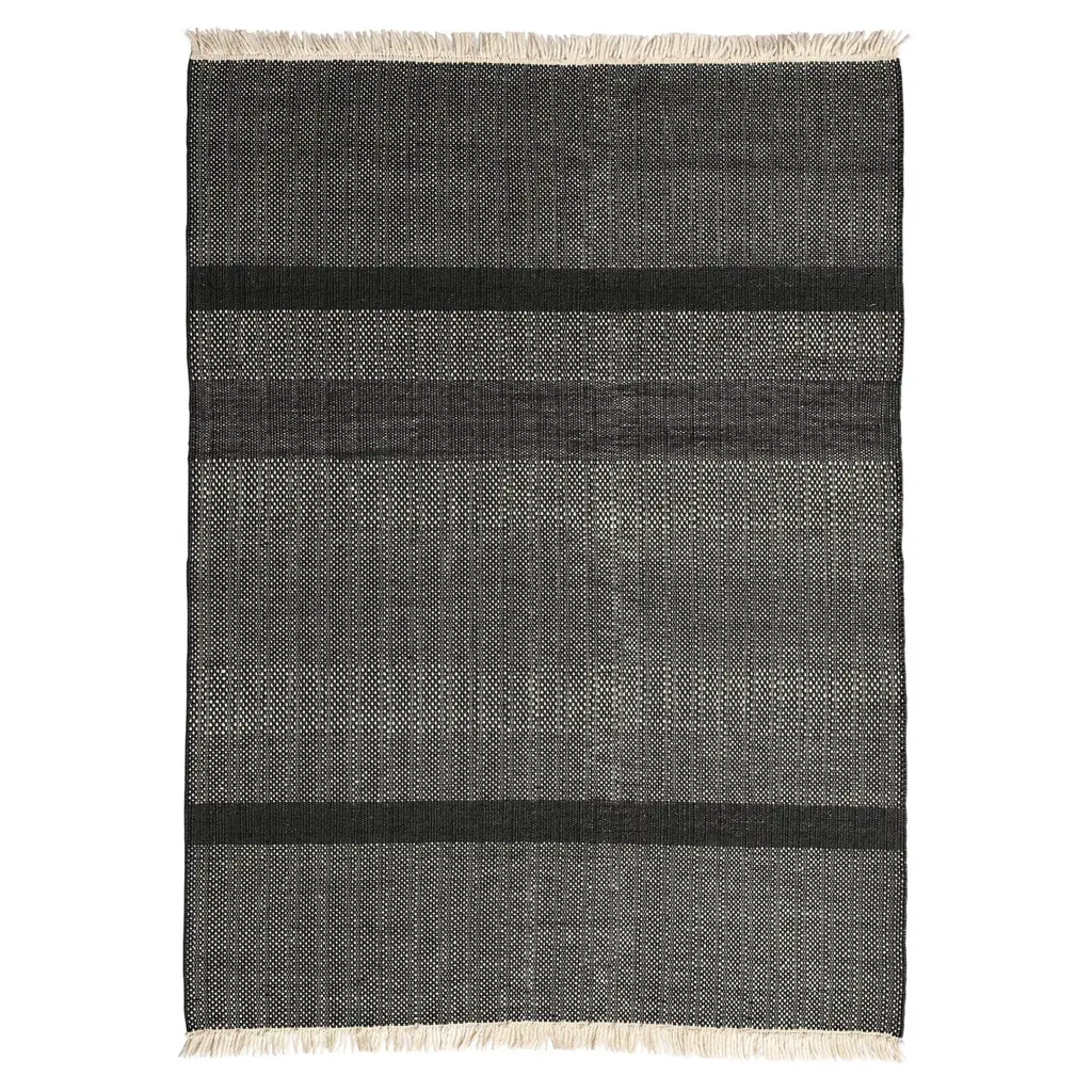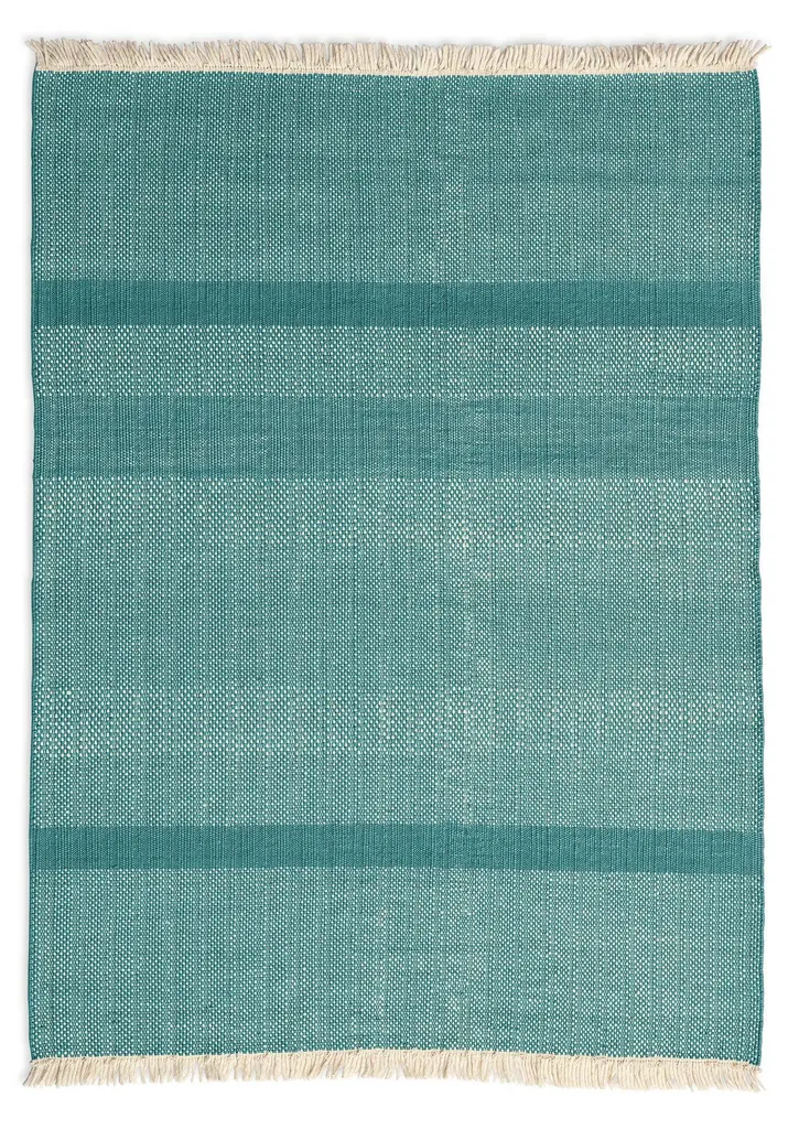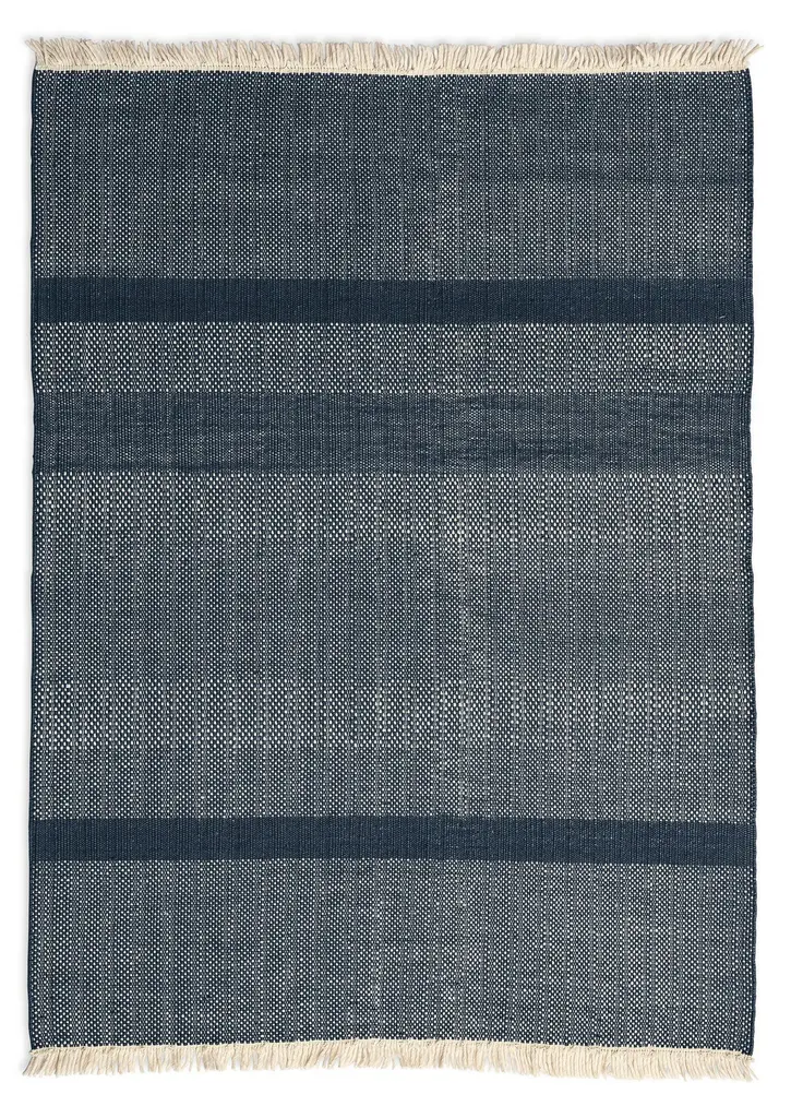 Large 'Tres Texture' hand-loomed rug for Nanimarquina.Fabricated from a natural blend of New Zealand wool and felt, 'Tres Texture' is a traditional Indian flat-weave Dhurrie rug. Its unique quality lies in the production of three independent parts in which the different fibers are allowed to shine. The commingling of the materials highlight subtle changes in tone and irregularities in the weave, bringing the handmade nature of this pattern brilliantly to life. This 'Texture' version further simplifies the principle of the Tres family while at the same time maintaining the stripes of different colors and thicknesses.Nani Marquina founded her namesake company in 1987 in Barcelona. More than 30 years later, the company continues to offer artisanal rugs worldwide without compromising on design, quality, or aesthetics. Each rug is crafted with respect for the environment, with outdoor rugs made from 100% recycled PET in an innovative process that reduces up to 70% of water waste.Price is per item. Available in unlimited quantities in four standard sizes and in choice of black, blue, salvia, ochre, green, chocolate, pearl, and gold. This listing is for the large-sized rug; please specify color when ordering.Custom sizes available upon request for an additional fee and with extended lead times possible.In-stock lead time 11-12 weeks. Out of stock or custom sizing can add additional 14 weeks or more. Inventory availability subject to change at any time.Please note that due to the organic and handmade nature of this fiber some variation in color may occur from piece to piece, which may become further pronounced with prolonged exposure to sunlight. Only one representative example of the rugs is shown in the images.Also note this item must ship directly from Nanimarquina’s fulfillment center, so 1st Dibs arranged shipping and local pick-up are not an option. Shipping cost quoted is per item and cannot be combined.Hand made to order. All sales are final.