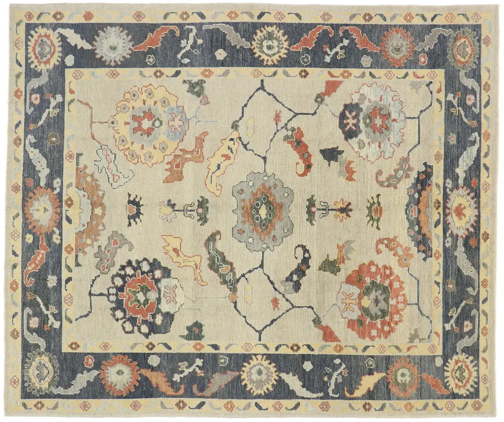 Oushak rugs are prized for their soft hues and designs that marry botanical and geometric motifs. This rug is a stellar example. Hand-knotted of wool by Indian artisans, it will maintain its beauty for years, if not generations. A rug pad is recommended to help prevent slipping and extend the life of the rug.