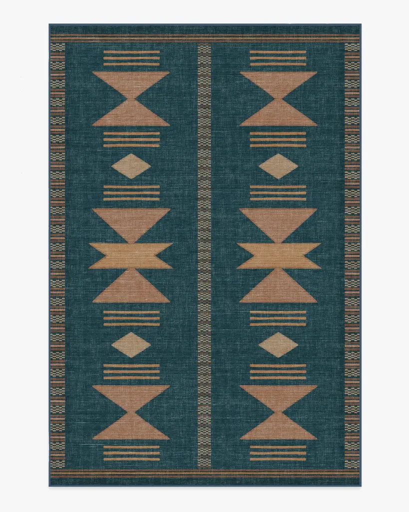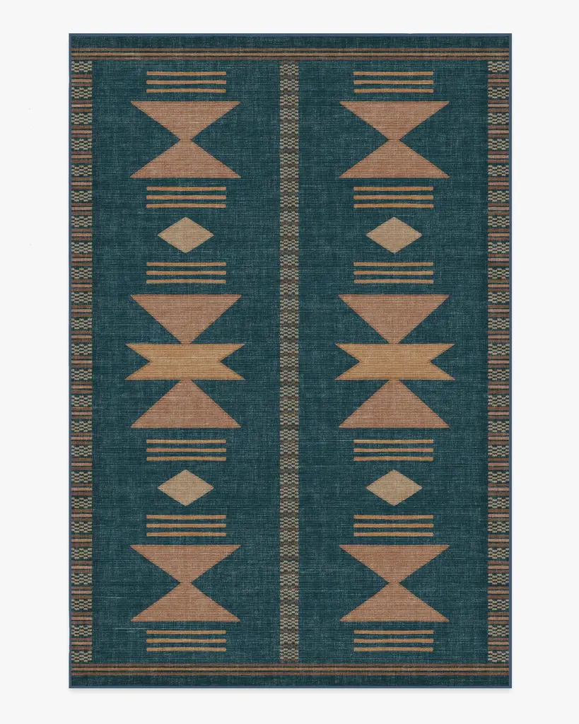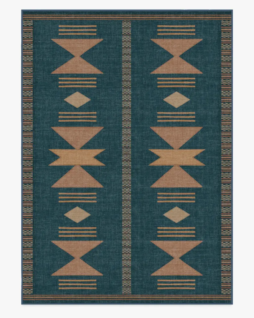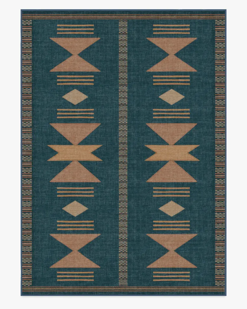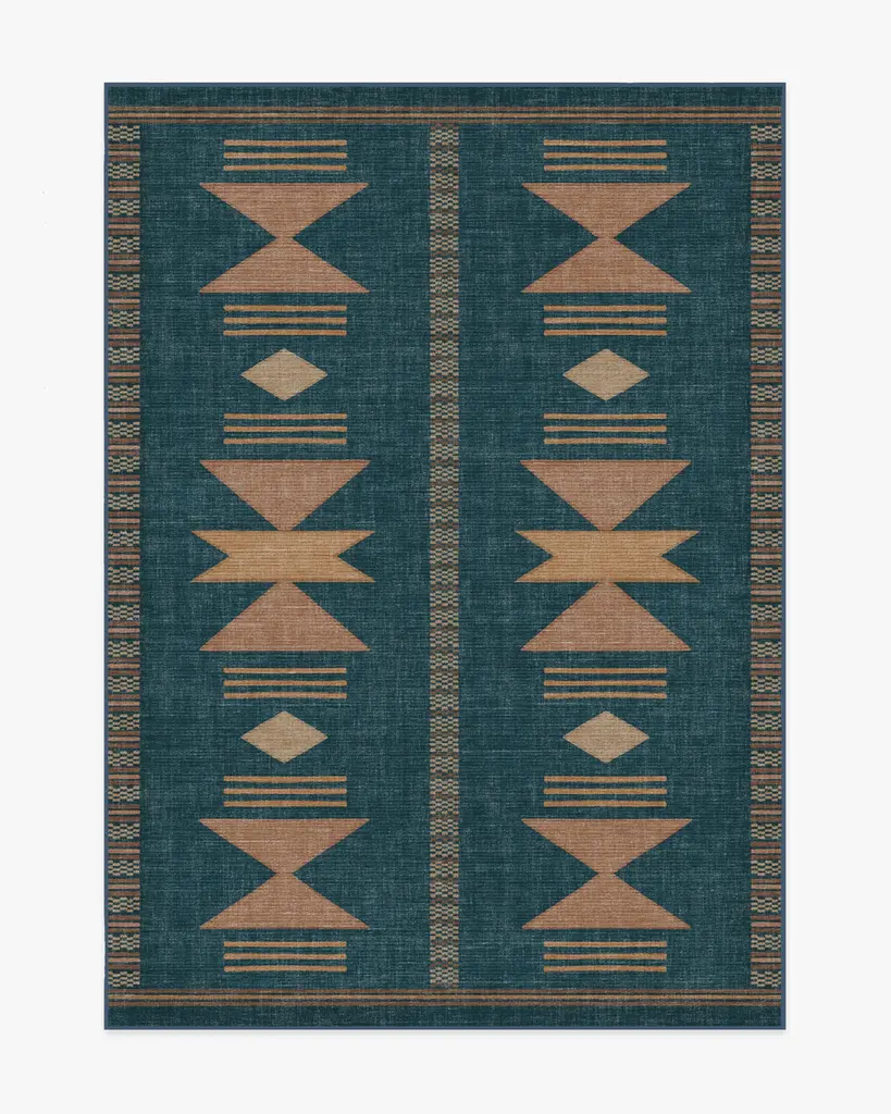 Journey across the globe with our Lark Blue & Rose Rug. This modern take on familiar Southwestern geometrics brings a rustic refresh to any space. Delicate checkerboard patterns in a hand loom woven texture offer subtle global accents, while motifs in dusty copper rose, gold, and creams create a warm and inviting atmosphere against an ocean blue background. Water-resistant, stain-resistant, and machine-washable. Rug colors may vary slightly according to your device and the lighting in your space.