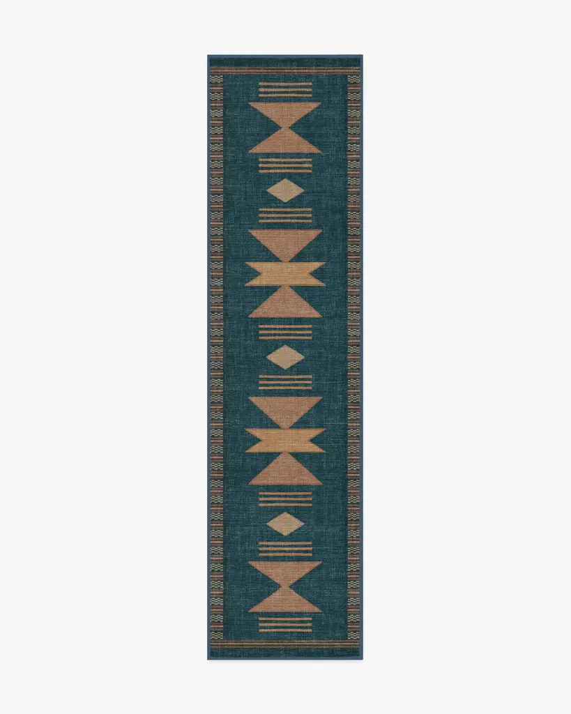 Journey across the globe with our Lark Blue & Rose Rug. This modern take on familiar Southwestern geometrics brings a rustic refresh to any space. Delicate checkerboard patterns in a hand loom woven texture offer subtle global accents, while motifs in dusty copper rose, gold, and creams create a warm and inviting atmosphere against an ocean blue background. Water-resistant, stain-resistant, and machine-washable. Rug colors may vary slightly according to your device and the lighting in your space.