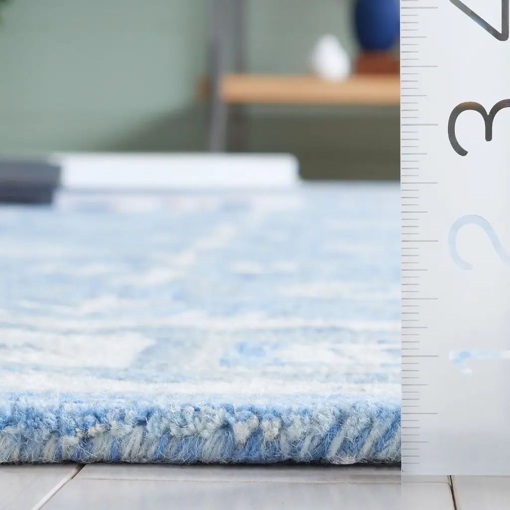Transform your living space with the elegance and charm of this large rectangle area rug, size 10 feet by 14 feet, boasting a timeless blue and ivory color palette. The design features an intricate pattern of floral motifs and geometrical shapes, creating a harmonious blend of traditional and contemporary aesthetics. The rug's height stands at a comfortable 3/8 inch, perfect for underfoot comfort without compromising on style. Each rug is meticulously hand tufted, a craftsman technique that ensures durability and adds a unique touch to each piece. The blend of 80% wool and 20% cotton guarantees a soft texture that is both warm and resilient, making it an ideal choice for any area of your home. Crafted in India, this rug not only brings with it the heritage of one of the world's most renowned rug-making regions but also a promise of quality and meticulous attention to detail. The combination of luxurious materials and exquisite design makes this rug a must-have for those who seek to add a touch of sophistication to their decor.