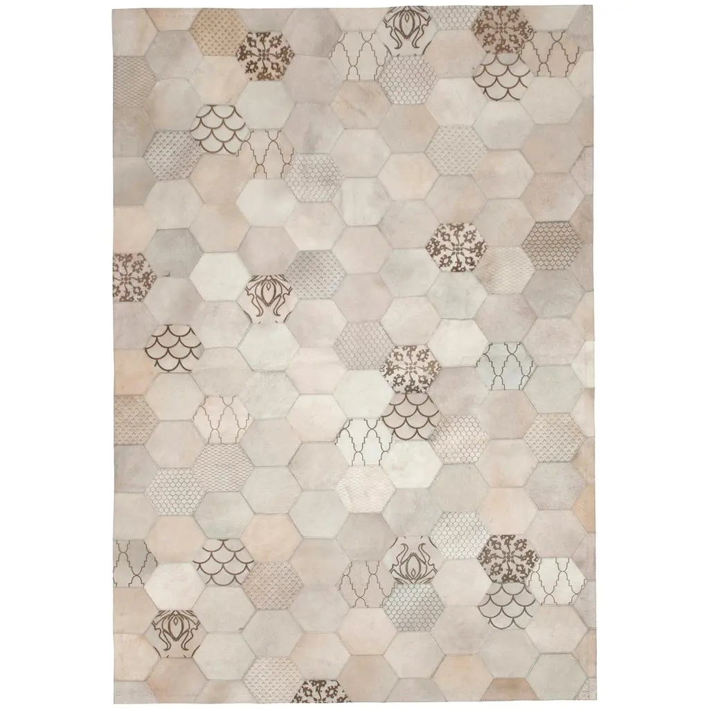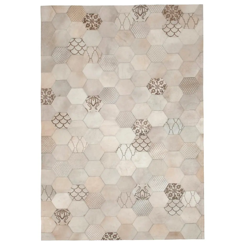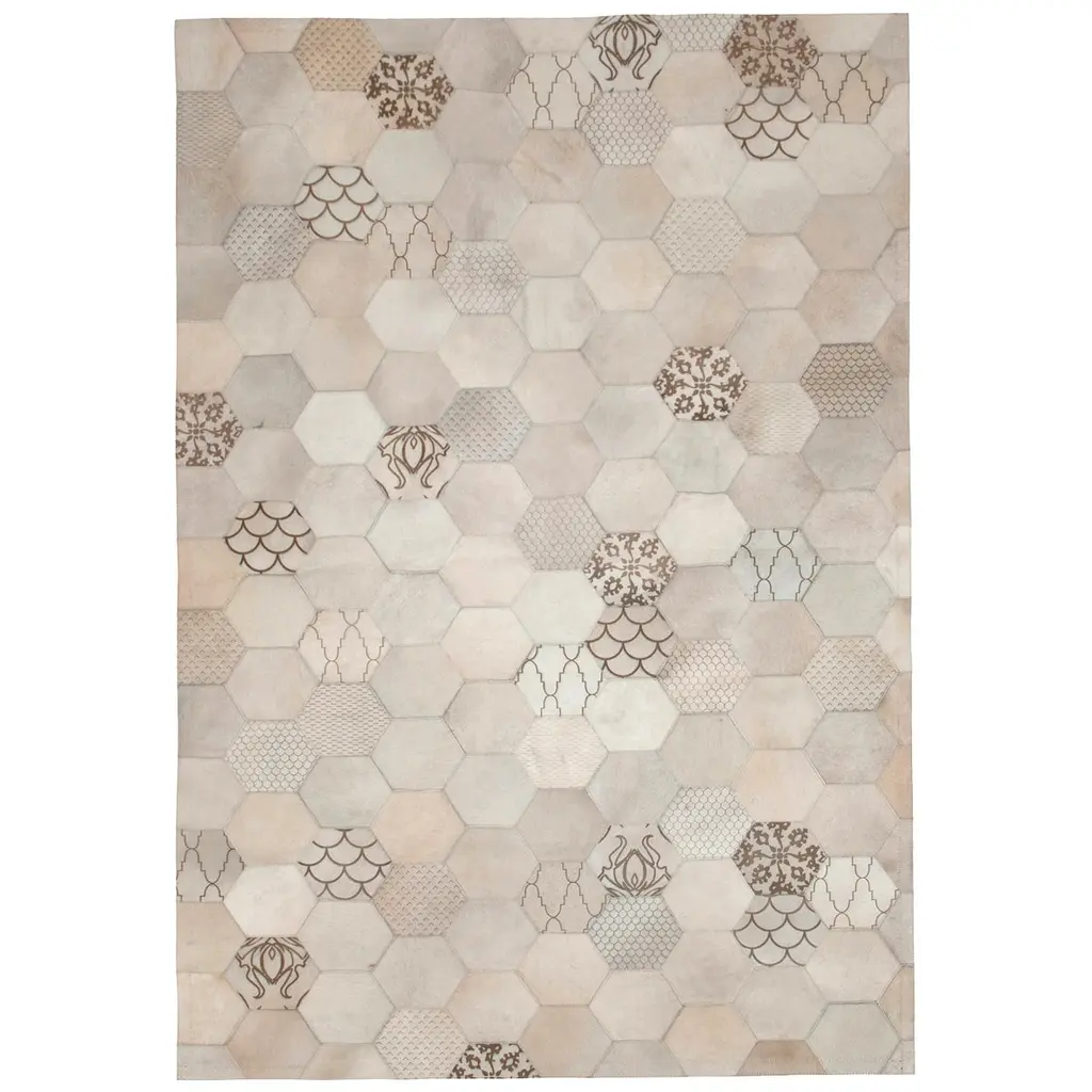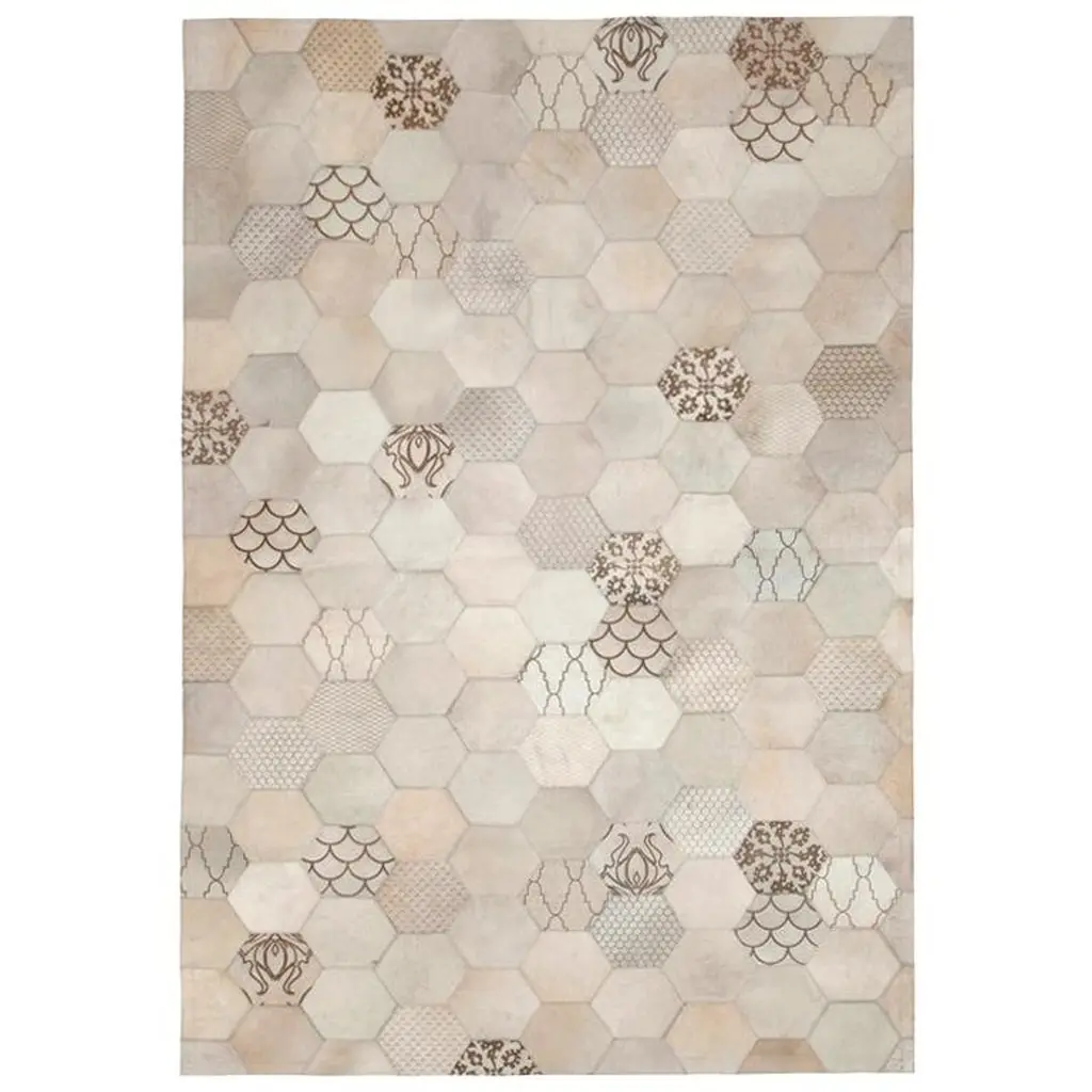 This high-impact, jaw dropping beauty fashionably displays all of art hide’s signature laser burns has now been adapted in beautiful tones of grey and cream is sure to create a statement and turn heads.This rug is created from premium quality cowhide, sourced from Brazil and Argentina. The Atomo is cut to precise angles and then pieced together using commercial grade nylon thread to create its stunning effect. Small measures: 2 x 1.6m (6’7” x 5’3”) and large measures: 2 x 3M (6’7” x 9’8”) and X-large measures: 2.75 x 3.65m - 9' x 12'This item can easily be customized to any color size or shape upon request.Art hide rugs are usually made to order. Please allow 4-5 weeks for delivery.