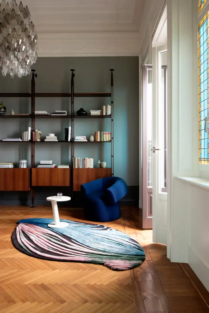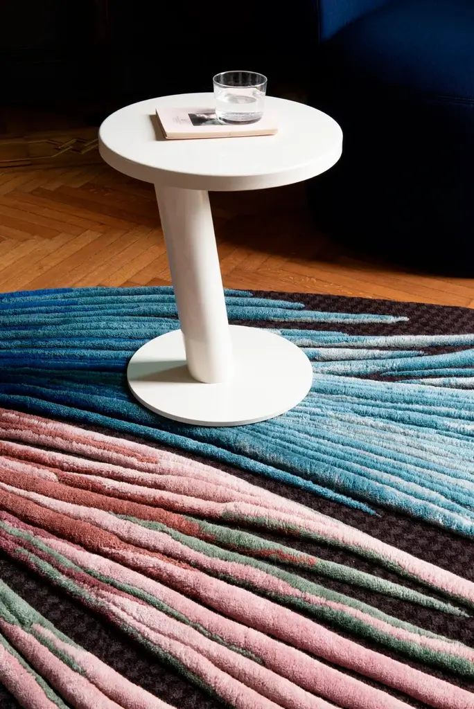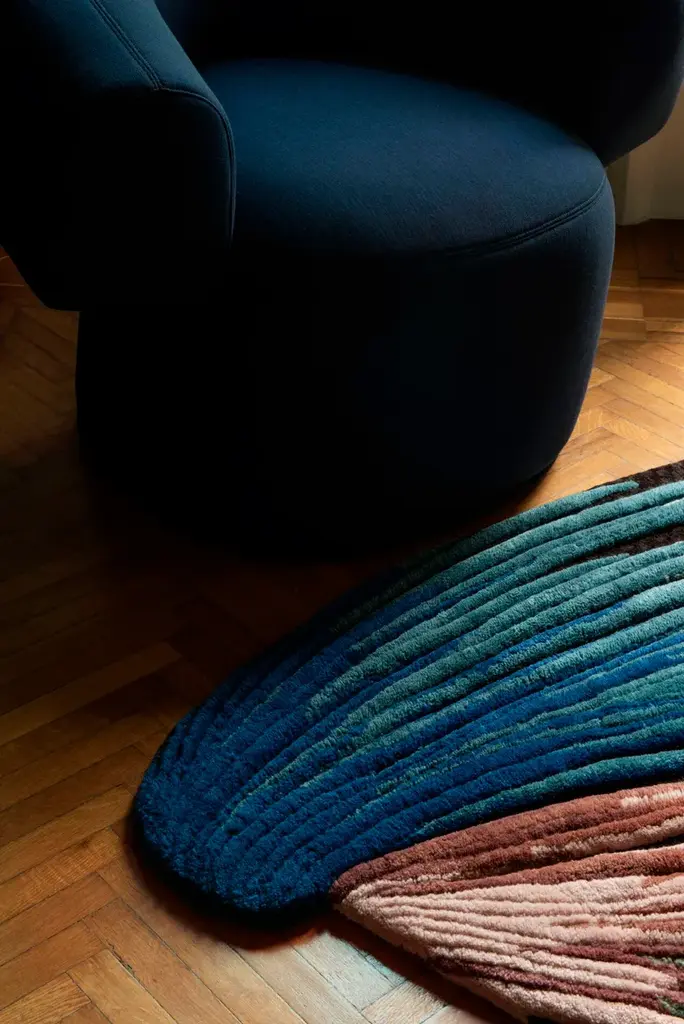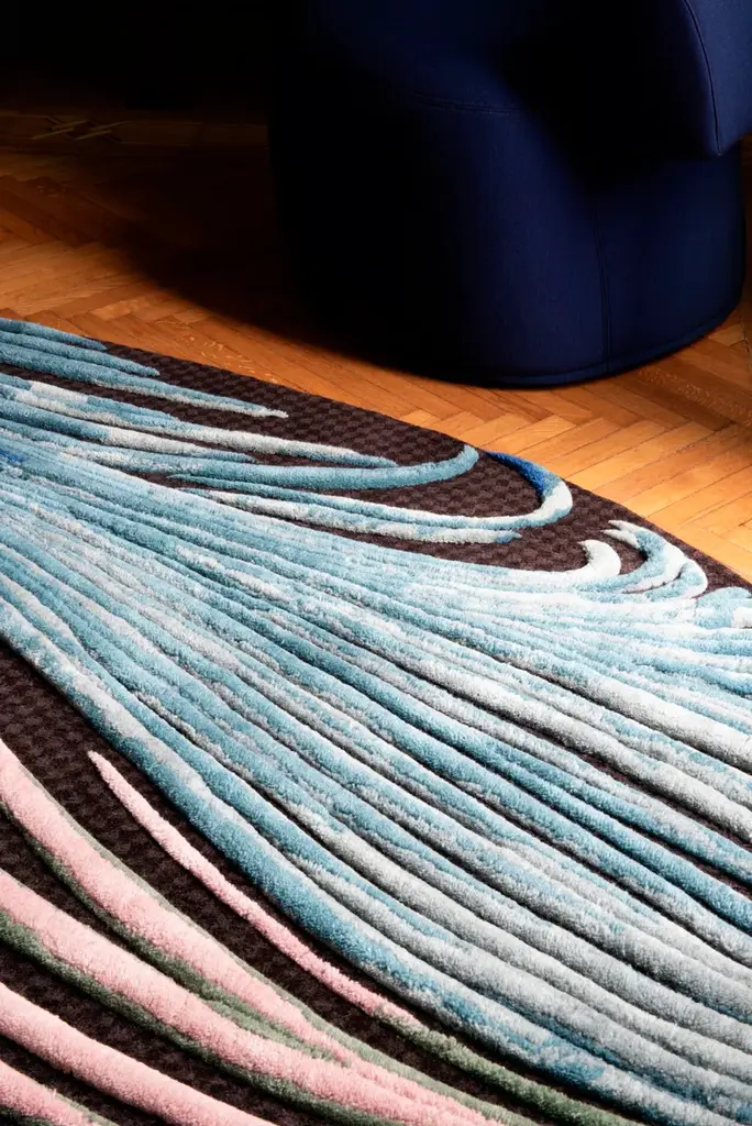 Material: WoolPile Height: 2 - 16mmTechnique: Hand-knottedCustom sizes and colors on requestInspired by the beauty and philosophy of the natural electromagnetic spectrum as a starting point for each design, the Tapis Rouge Studio team looked to the four frequencies of light radiation and their respective wavelengths and photon energies, translating them into a collection of 14 distinctive designs that blend fluid forms with striking color gradients. Rugs in the Laser hand-knotted series are characterized by innovative, dynamic shapes and a rounded cut of the long pile, which range from 2 to 16 mm, achieved in the manual carving stage: elements that result from deliberate formal and technical experimentation and research. Laser Mercury is 100% wool but can also be requested to be combined with silk to give the background light accents.