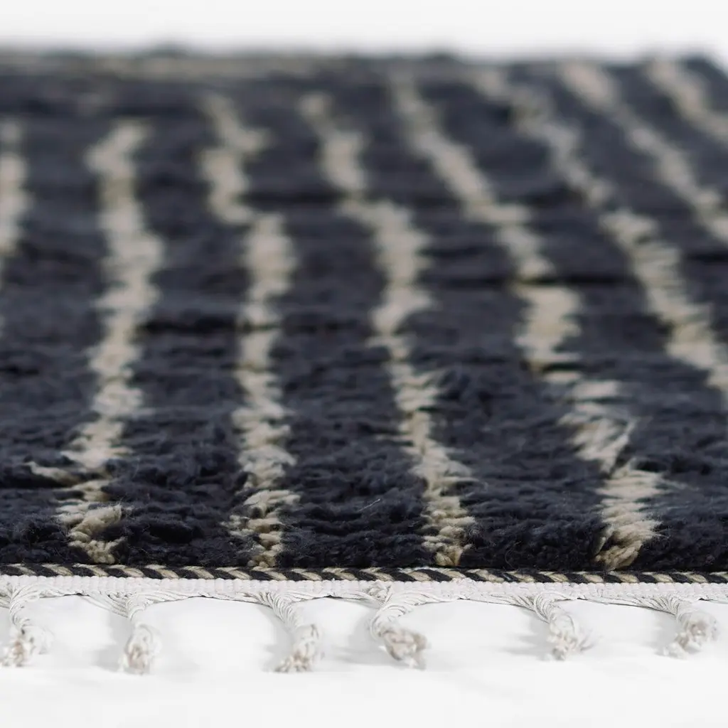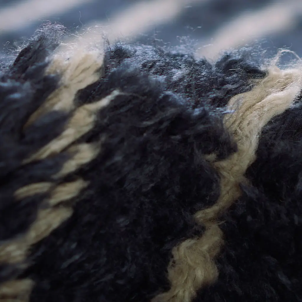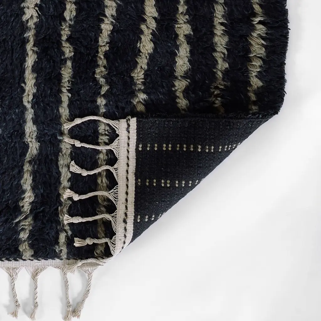 Beautiful hand woven thick shag rugs made from 100% New Zealand wool, using mill spun yarns. Made in India, the yarn is locally dyed in the traditional Vat Dying method. Before the first wash, the back of each rug is mildly burnt with hand-held flame emitting stoves. The rugs are given two rounds of rigorous washing, to provide the softest comfort underfoot. The finishing process includes hand shearing, with a unique and exaggerated one sided tassel fringe. Each tassel is twisted and rolled by hand into bunches with a knot tied at each end, for a unique hand-crafted appeal.