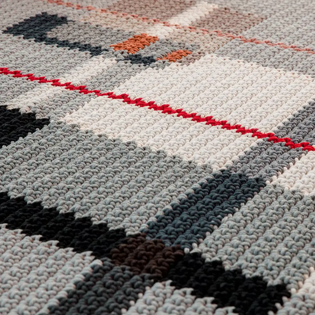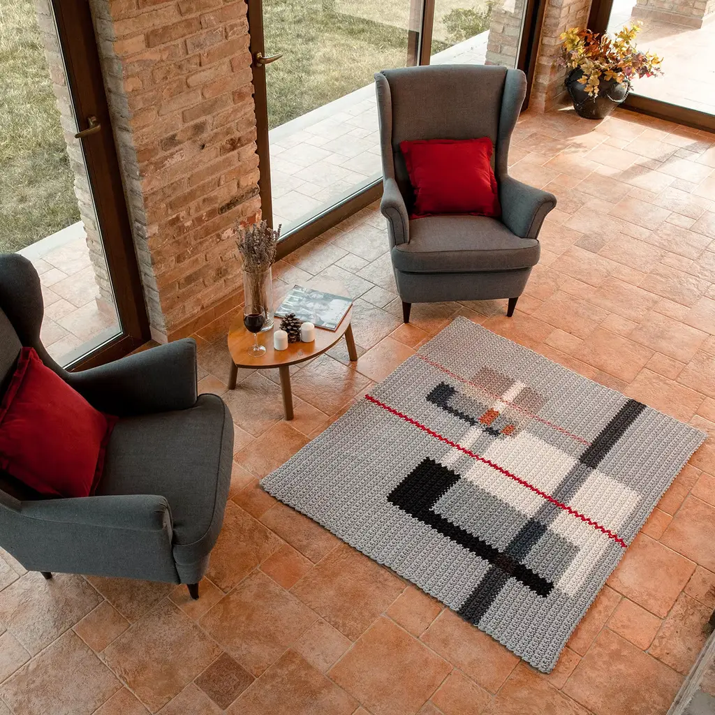 A celebration of László Moholy-Nagy, Hungarian painter, photographer, and professor of the Bauhaus school, this rug is a striking objet d'art. Crocheted by hand from a recycled natural dye-free cotton material, it boasts a striking decoration of strong geometric value. Making a statement in a modern living room, this piece is available in other sizes upon request.
