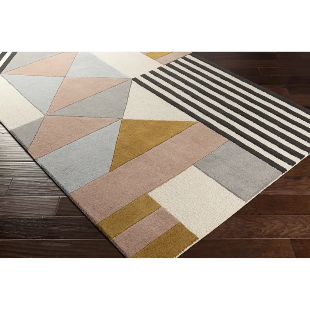 This area rug draws on a variety of patterns and bold color blocking to create a statement on your floors. Hand tufted in India from 100% wool, this rug leans on wool's natural resilience that makes it ideal in heavy traffic rooms. The overlapping patterns feature rectangles, triangles, and stripes in cream, light gray, and brown colors. The 0.6'' pile height lends this rug some extra cushioning while still being easy to care for. To clean, vacuum without a beater bar or spot clean.