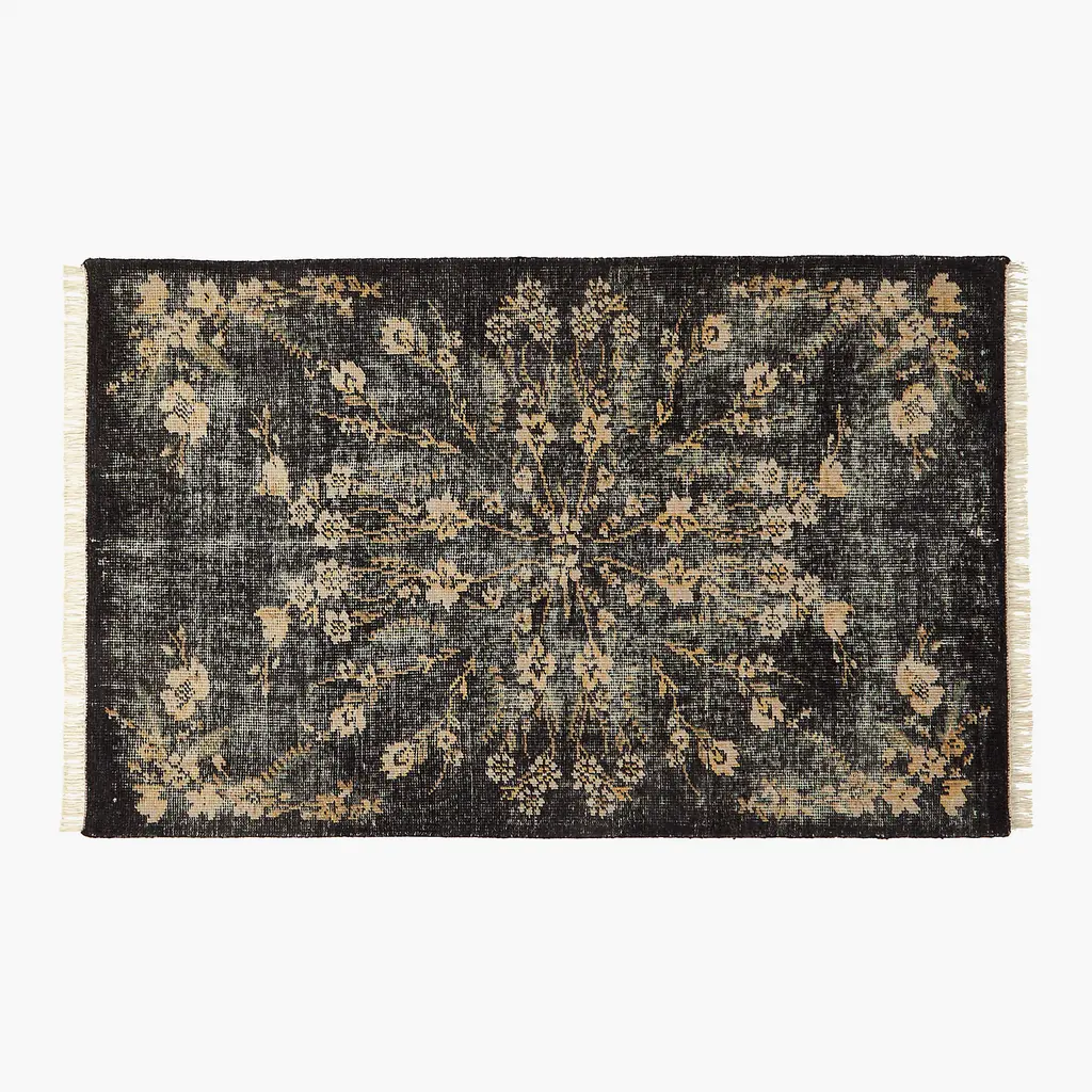 Reproduced from an original fine art print from London-based artist Felix Green, known for his unique take on traditional botanical designs. Hand-knotted from pure New Zealand wool in shades of black with refreshing hints of white, yellow and green. Each area rug is hand-distressed for a unique vintage feel and will vary slightly in tone. At 15-16 knots per square inch, low-pile rug is ideal for medium-traffic areas. CB2 exclusive.How will it look in your room? 12"x12" rug samples are available in stores for a fee refundable upon return of the sample.