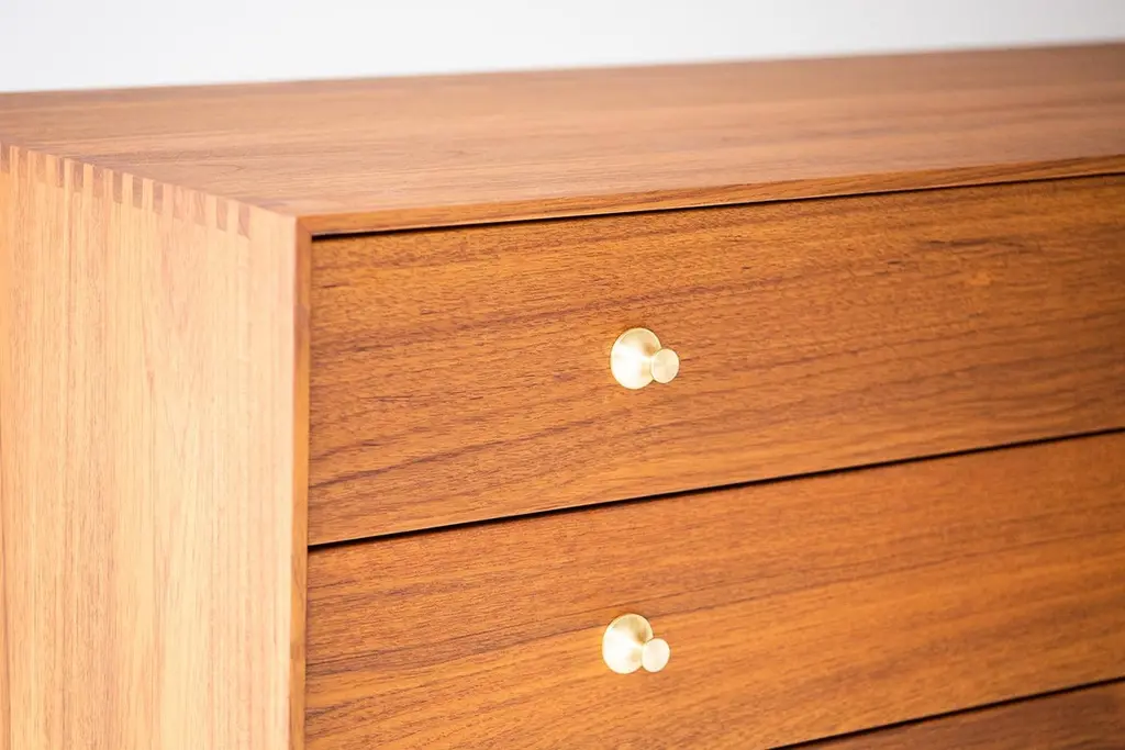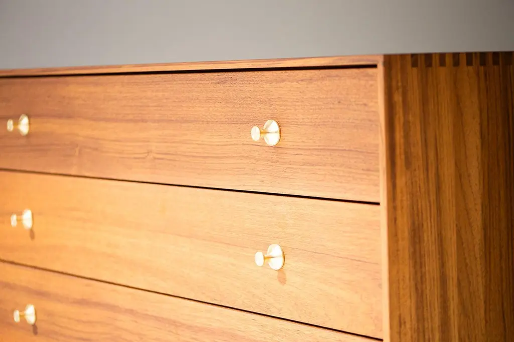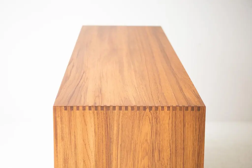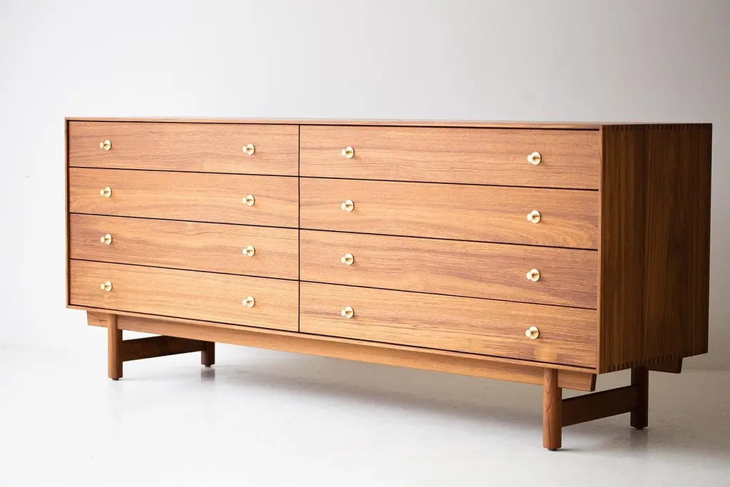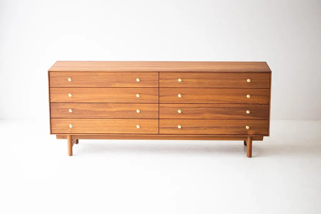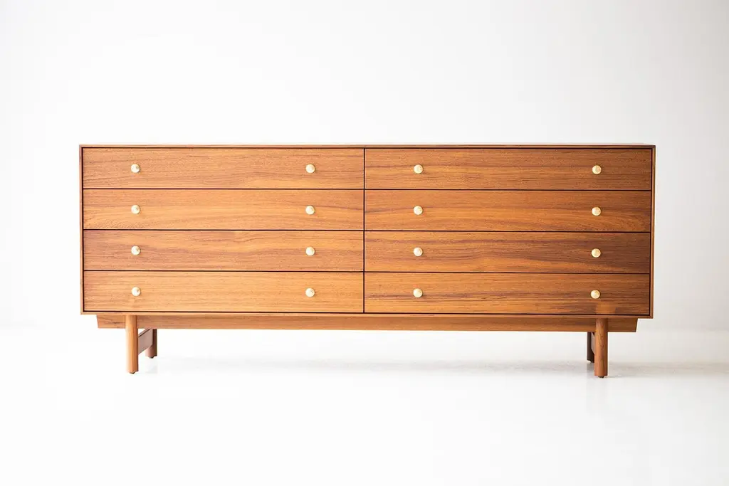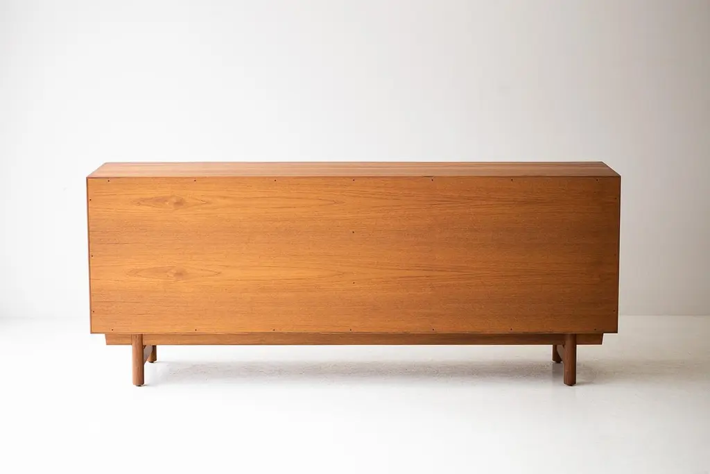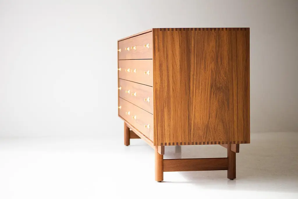 designer: Lawrence PeabodyManufacturer: Craft Associates® FurniturePeriod/Model: Mid-Century ModernSpecs: Teak, brassDimensions H: 30.5" (77.47cm)L: 75" (190.5cm)D: 19" (48.26cm) / 20" (50.8cm) Including pullsCondition : This Lawrence Peabody Teak Dresser 2202P for Craft Associates Furniture is expertly hand crafted. The Peabody collection pieces are licensed reintroductions for Craft Associates®. This dresser is Teak with box joints on top and bottom, soft close drawers, teak dovetail interior drawers and turned solid brass pulls. It is available in custom wood and variations (different sizes, different color pulls, box joints available on top and bottom or without). Craft Associates® Furniture is proud each modern piece is made in the US. We strive to craft a product that will stand the test of time. We use the best materials and have the best craftsman and upholstery in the business. We stand 100% behind our product. "The U.S. would profit by the example of the Danes, whose great work in furniture design is the result of combining proficient craftsmanship, fine design and technical skill. The Danes do more than sell arts and crafts in their distinguished work, they sell Denmark." - Lawrence Peabody, 1957 historyLawrence “Larry” Peabody (1924-2002) was an architect, interior designer, and furniture designer. As an American born in Haverhill, Massachusetts, his distinctive design were often influenced by his Scandinavian roots. Lawrence studied at the Royal Academy of Fine Arts in Copenhagen, Denmark and at the Rhode Island School of Design. His early career with Selig Mfg. Co. was prolific and helped put both himself and Selig on the map for modern furniture. He then started Lawrence Peabody & Associates in 1955, a design firm in Boston which included a vast client list (Sears, Roebuck & Co., Kohler, Regal Rugs, Boyd Lighting, Chapman Lamps, and Richardson Brothers). In 1961, Mr. Peabody won a Citation for Merit for his Peabody Collection for Richardson/ Nemschoff. Winner of the 1962 International A.I.D. design award for his wood frame rattan cradle chair, he also received the Walnut Classic Award for outstanding established collection of furniture executed in walnut. Craft Associates® Furniture is honored to have acquired the rights to produce licensed Lawrence Peabody designed furniture.