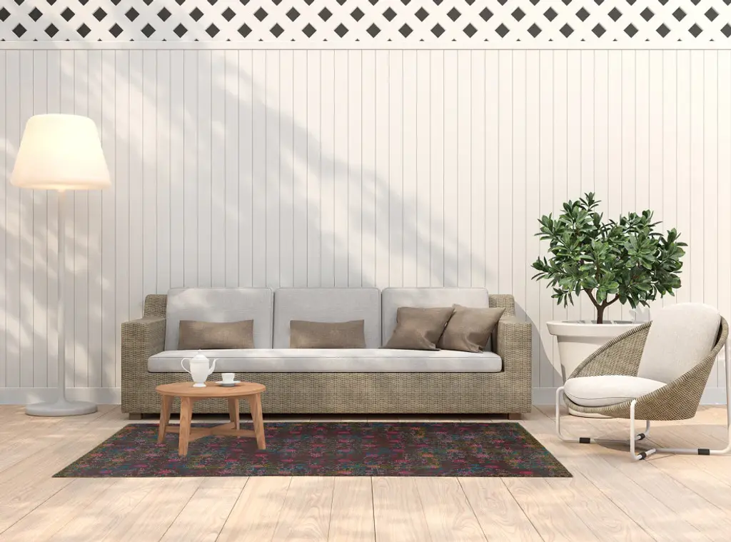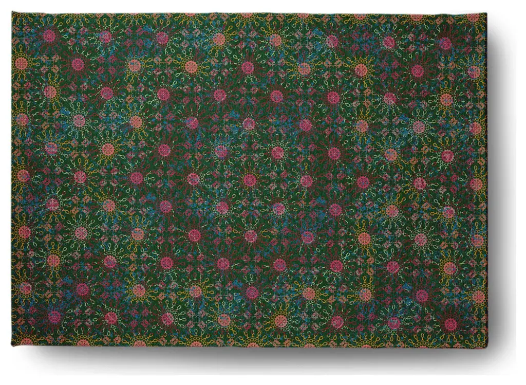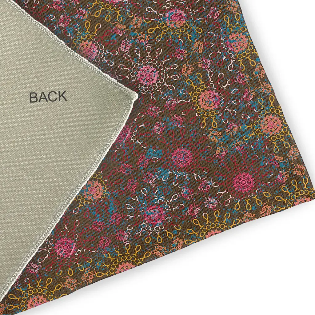 Bring a fun vibe into your home with a Layered Sun Tile Indoor/outdoor Rug from our HH Revival Collection. Everyone will delight in the space defining design brought to your porch, patio, kitchen, or bathroom by this area rug. The artistic and colorful design is printed on a soft polyester base with a skid resistant backing, making it a perfect way to add color, flare and personality to any indoor or outdoor space. To clean, use a mild soap and lay flat to dry.