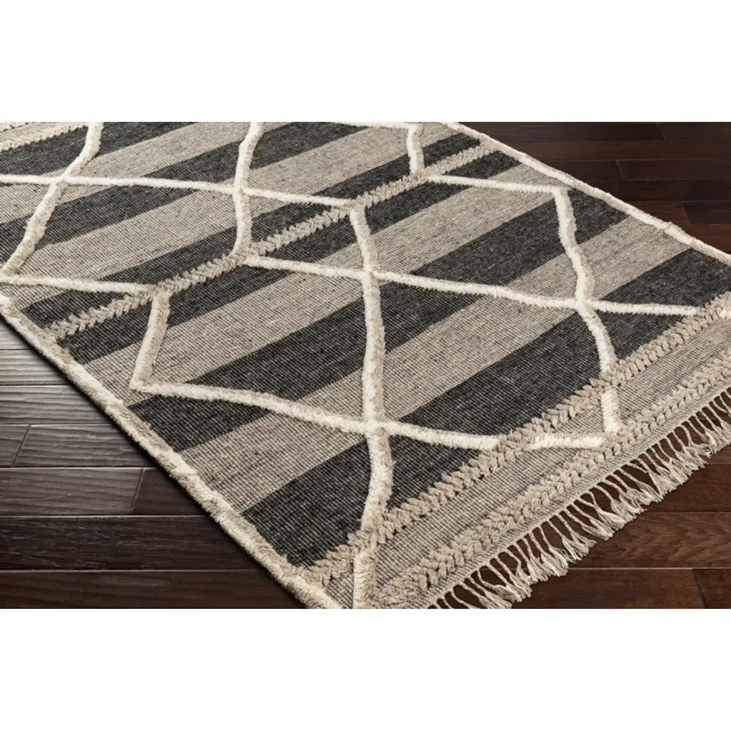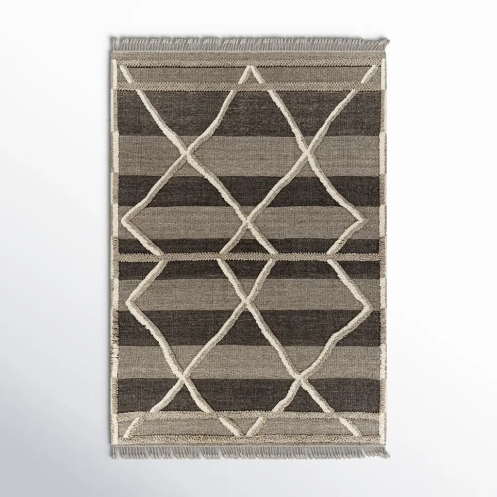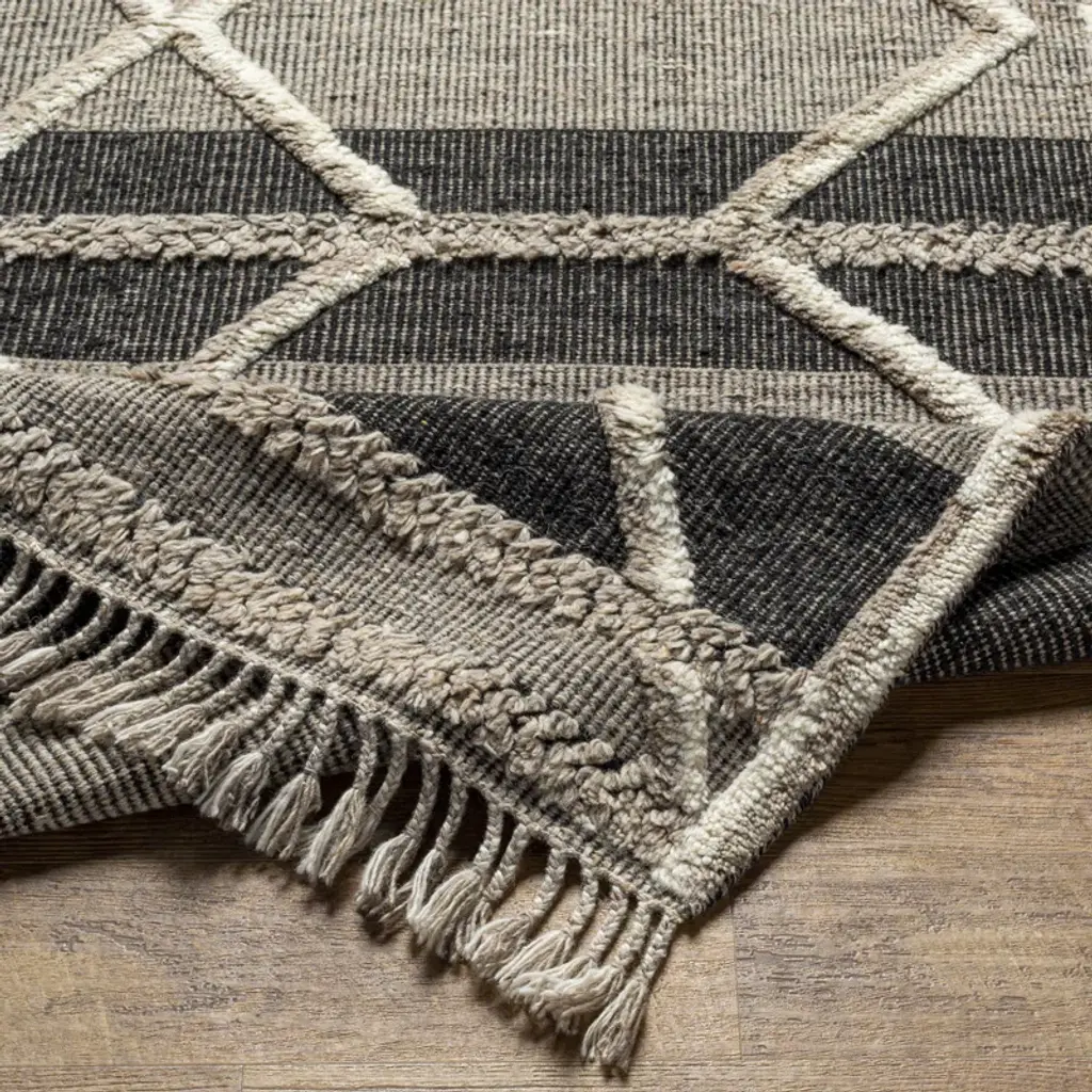 Ready to provide a textured surface underfoot, our hand-knotted indoor rug is a standout addition to any room thanks to its zigzag and stripe designs and a high-low pile. An eye-catching geometric motif inspired by Moroccan patterns brings depth to your floor, while dynamic fringe and a color palette of black, cream, and gray add a bold touch to your space. Woven from wool, a high 1.25" pile makes it ideal for low-traffic locations. To keep it from slipping and sliding around, we think adding a rug pad is a smart idea.