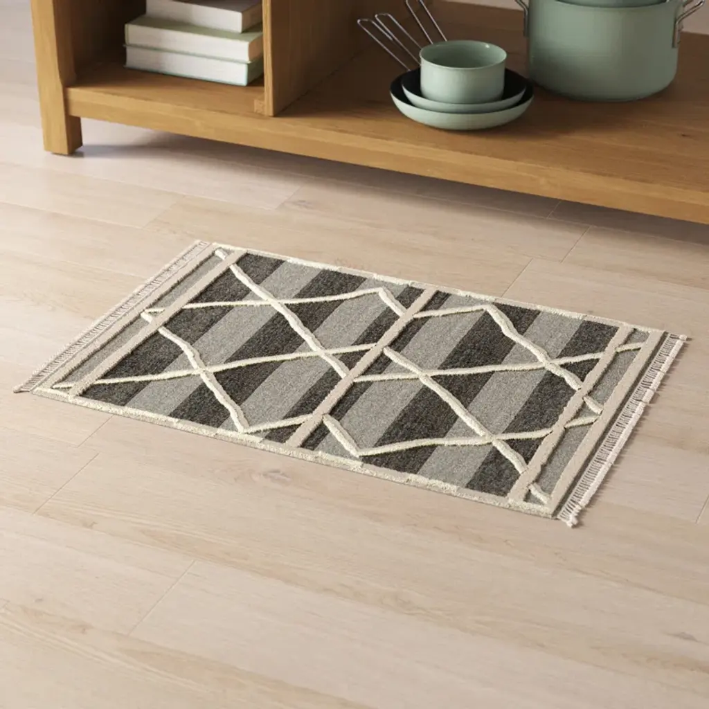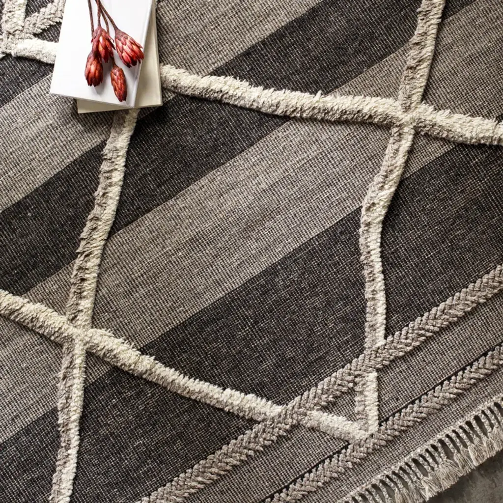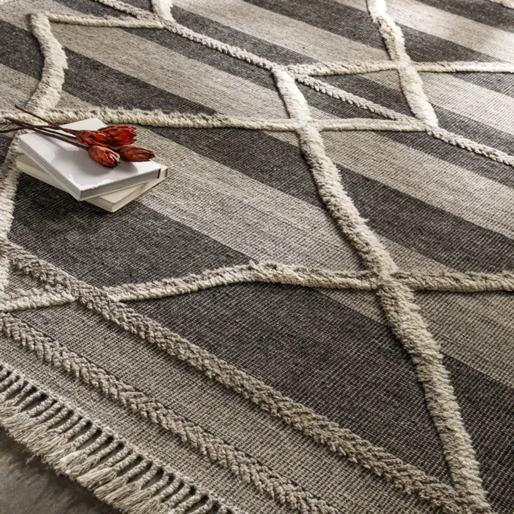 Ready to provide a textured surface underfoot, our hand-knotted indoor rug is a standout addition to any room thanks to its zigzag and stripe designs and a high-low pile. An eye-catching geometric motif inspired by Moroccan patterns brings depth to your floor, while dynamic fringe and a color palette of black, cream, and gray add a bold touch to your space. Woven from wool, a high 1.25" pile makes it ideal for low-traffic locations. To keep it from slipping and sliding around, we think adding a rug pad is a smart idea.