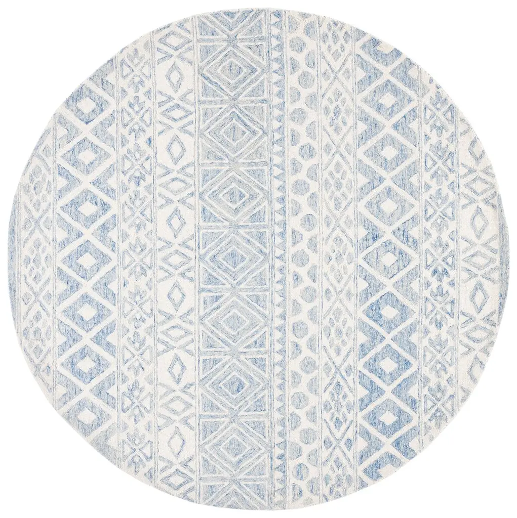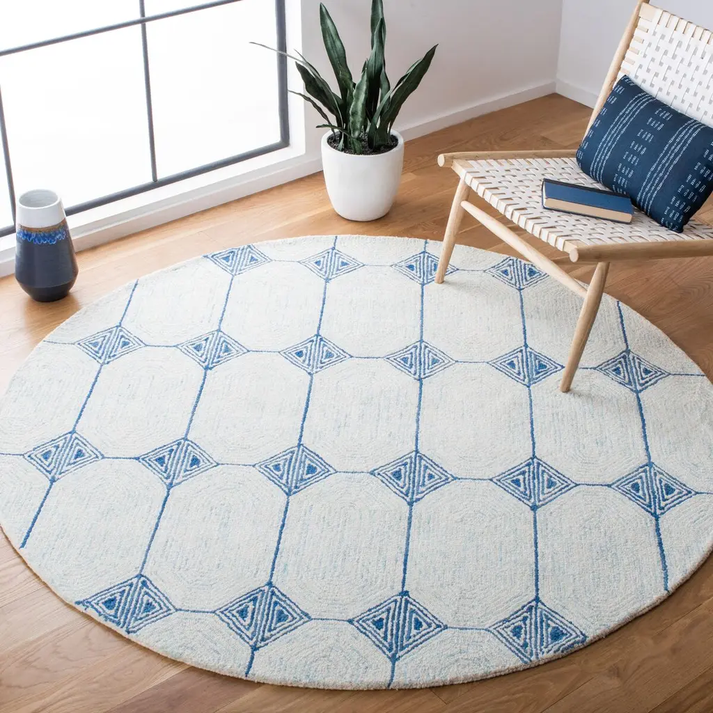 Elevate your space with our hand-tufted Contemporary Ivory/Blue Rug, featuring an elegant geometric diamond motif. Crafted in India, this piece blends 80% wool and 20% cotton for a luxurious feel, with a pile height of 1/4". This 4' x 6' small rectangle rug adds a touch of modern sophistication to any room. Although not washable or slip-resistant, its quality construction offers both comfort and durable style. Perfect for adding a serene yet chic vibe to your home d?cor.