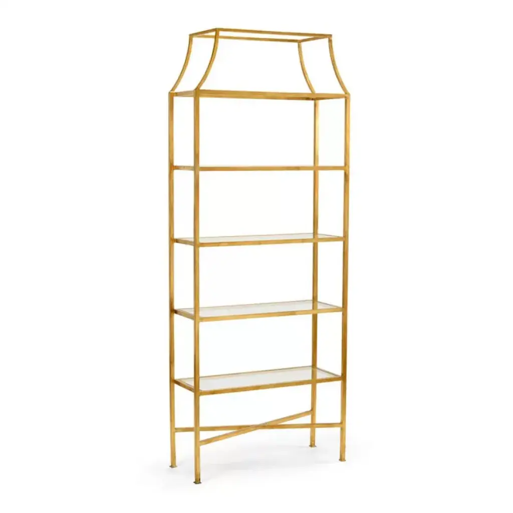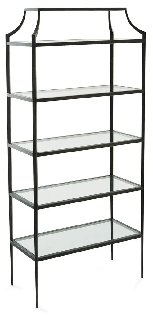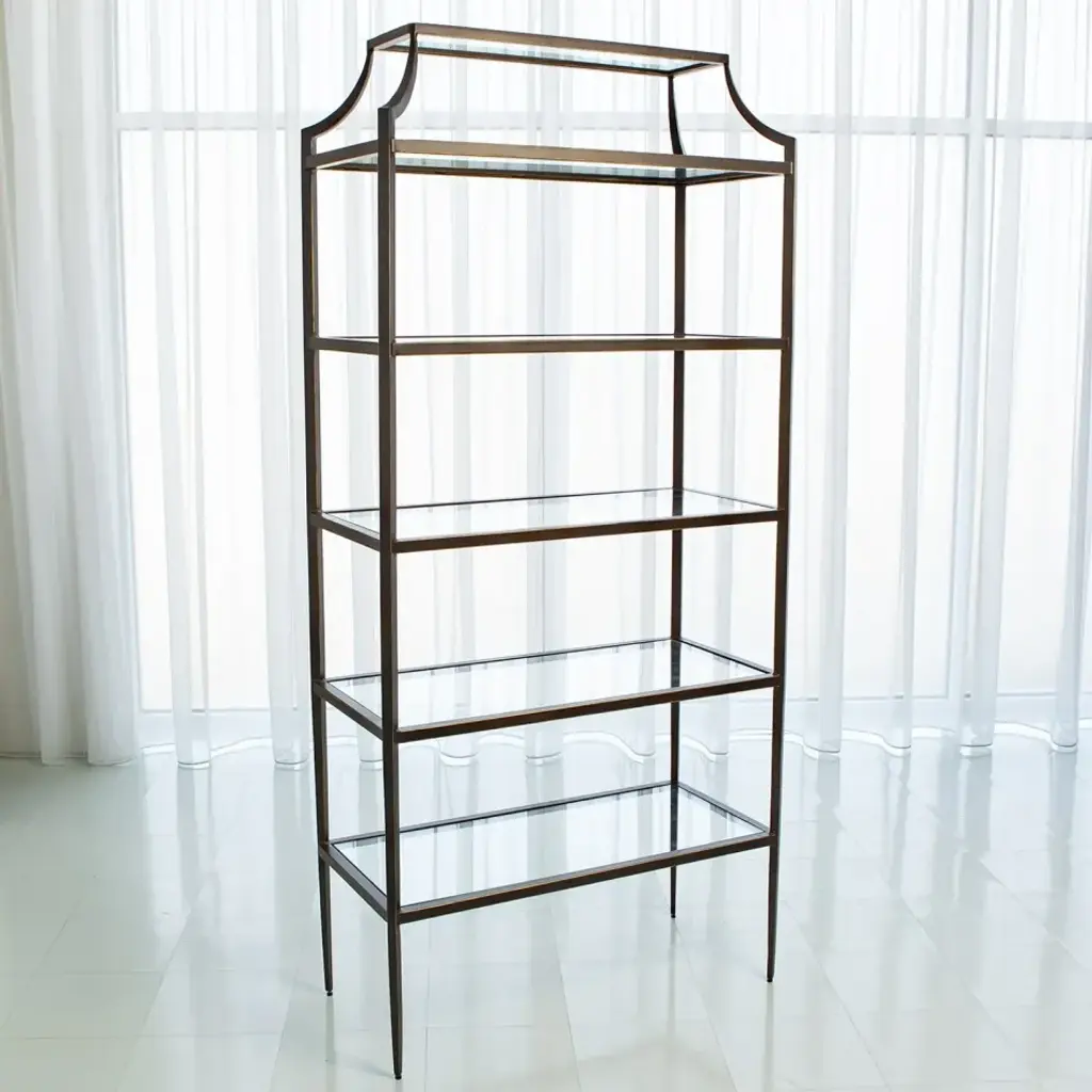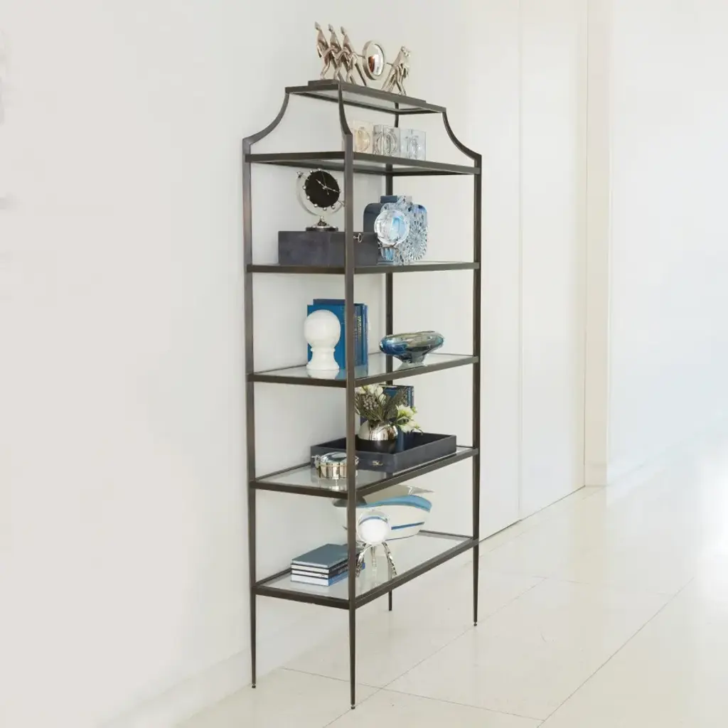 Lescot etagere has a Mansard inspired top detail made of bronze finished metal with tempered glass shelves and adjustable feet. From a fashion forward perspective, Global Views offers accessories, furniture, statement lighting, and an assortment of rugs and mirrors to add beauty and joy to your home.