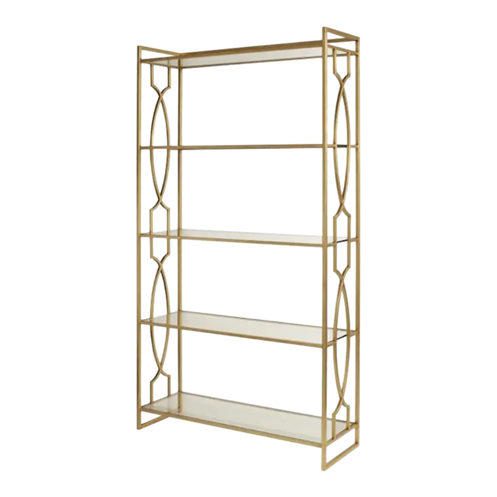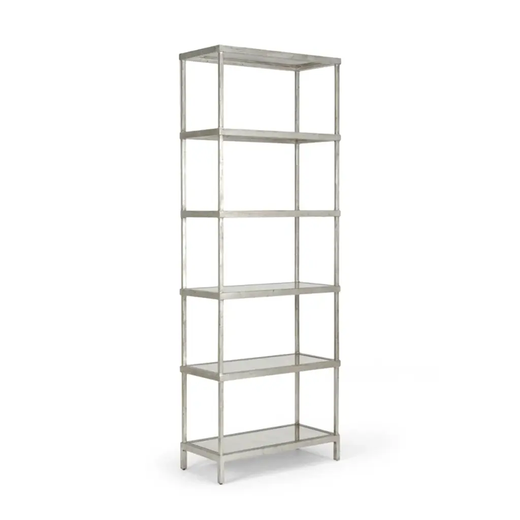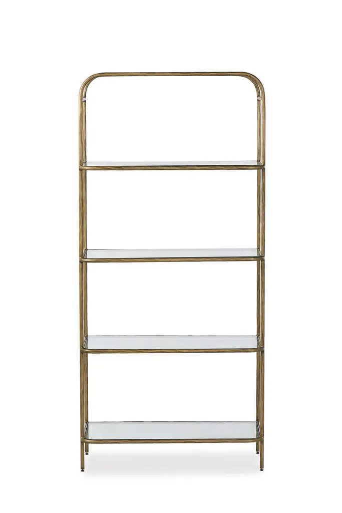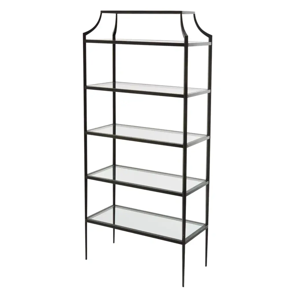 Lescot etagere has a Mansard inspired top detail made of bronze finished metal with tempered glass shelves and adjustable feet. From a fashion forward perspective, Global Views offers accessories, furniture, statement lighting, and an assortment of rugs and mirrors to add beauty and joy to your home.