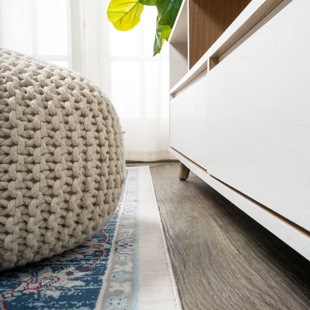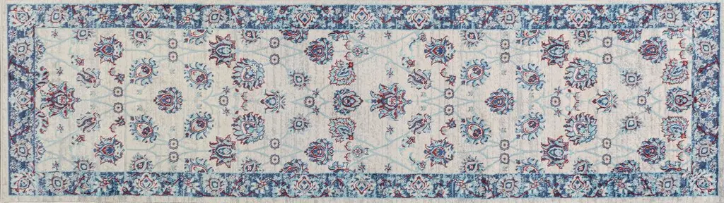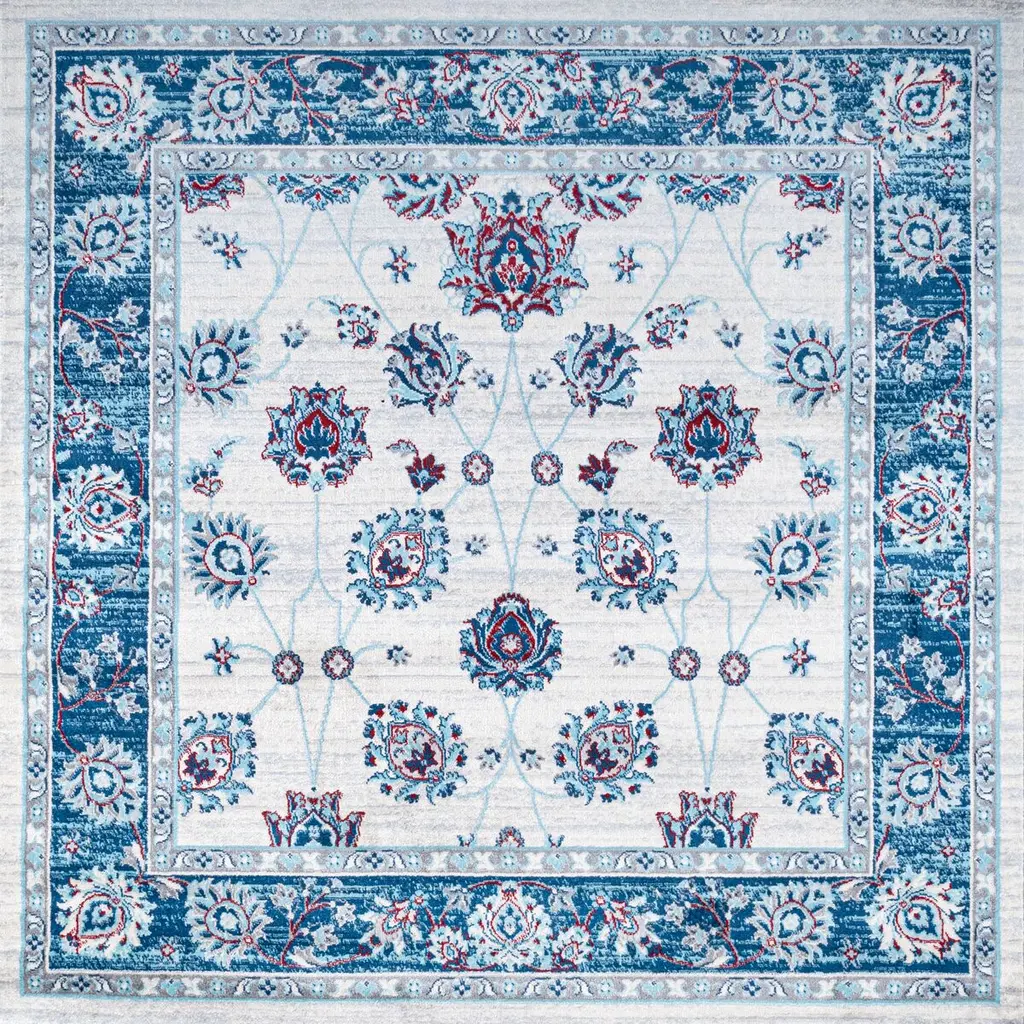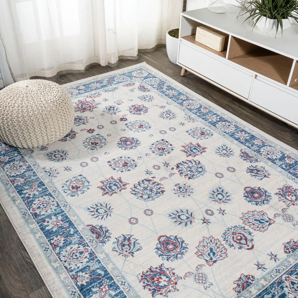 Vintage Oushak floor coverings inspired this polypropylene rug's floral design and intentional abrash—the fading that occurs to fine artisanal rugs over time. The reined-in palette, however, makes the rug a welcome addition to contemporary and traditional spaces alike. A rug pad is recommended to help prevent slipping and extend the life of the rug.