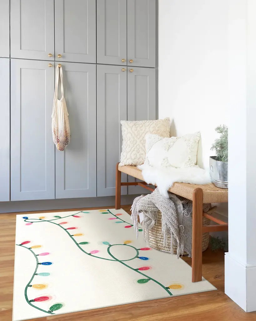 Bring cheerful whimsy to all who enter with the Let It Glow Cream Multicolor Rug. Strung with colorful holiday string lights, you’ll lay the groundwork for a very merry holiday with bold, energetic colors set against a warm, creamy background. Water-resistant, stain-resistant, and fully machine-washable. Colors may vary by device and lighting.