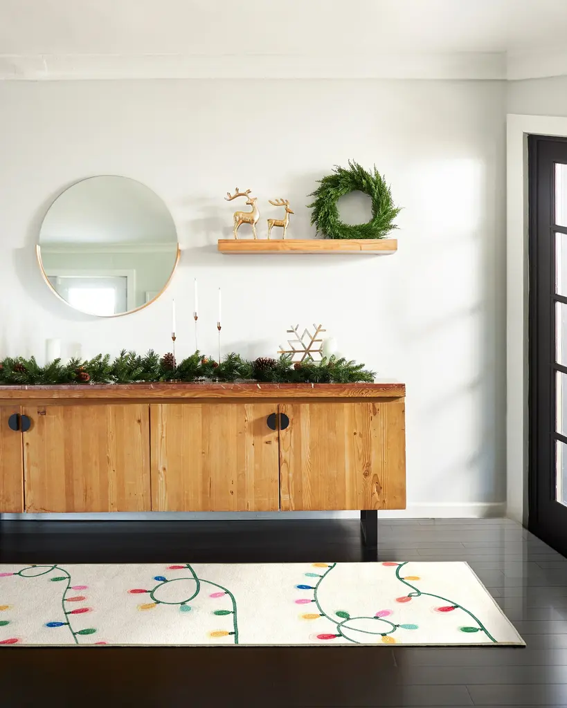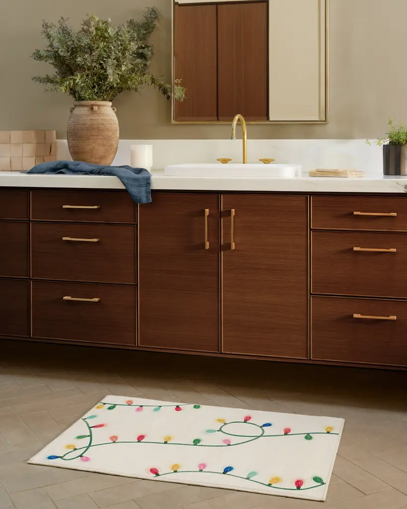 Bring cheerful whimsy to all who enter with the Let It Glow Cream Multicolor Rug. Strung with colorful holiday string lights, you’ll lay the groundwork for a very merry holiday with bold, energetic colors set against a warm, creamy background. Water-resistant, stain-resistant, and fully machine-washable. Colors may vary by device and lighting.