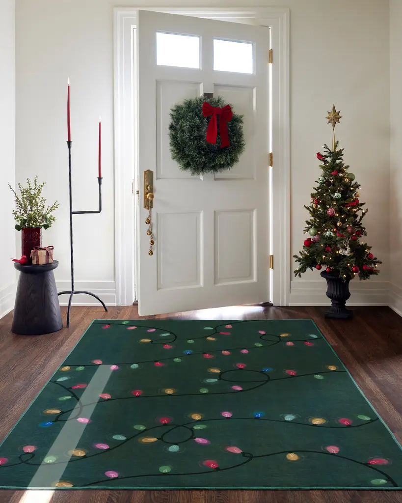 Twinkle season starts from the ground up. The Let It Glow Green Rug brings holiday charm to any room with its whimsical string of glowing lights. Bright touches of red, yellow, green, and soft hues of blue and pink create a festive, feel-good look that shines without stealing the show. No stringing necessary. Water-resistant, stain-resistant, and machine-washable. Colors may vary by device and lighting.