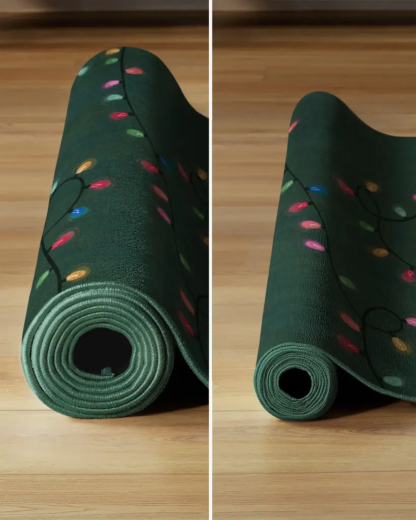 Twinkle season starts from the ground up. The Let It Glow Green Rug brings holiday charm to any room with its whimsical string of glowing lights. Bright touches of red, yellow, green, and soft hues of blue and pink create a festive, feel-good look that shines without stealing the show. No stringing necessary. Water-resistant, stain-resistant, and machine-washable. Colors may vary by device and lighting.