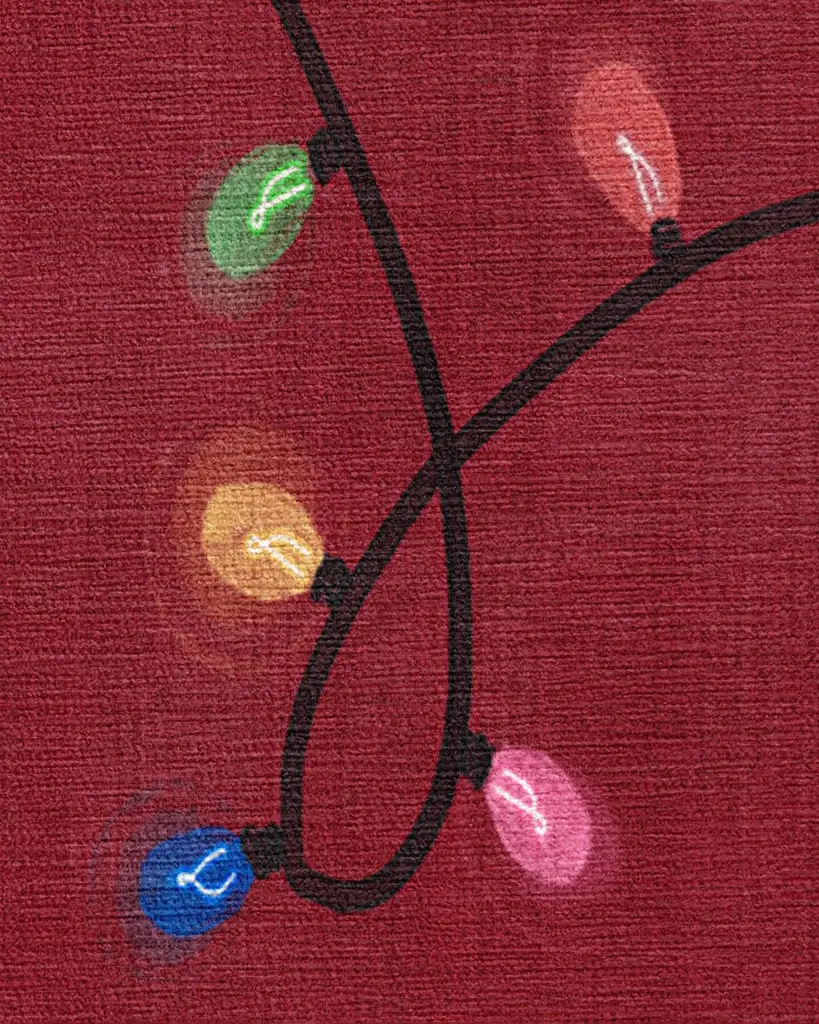 Glow big or go home. The Let It Glow Red Rug sets a warm tone for the holidays with its rich burgundy backdrop and decorative tangle of twinkling lights. Bursts of red, yellow, green, and soft blues and pinks add a colorful sparkle that’s all joy, no fuss. A shiny season is afoot. Water-resistant, stain-resistant, and machine-washable. Colors may vary by device and lighting.