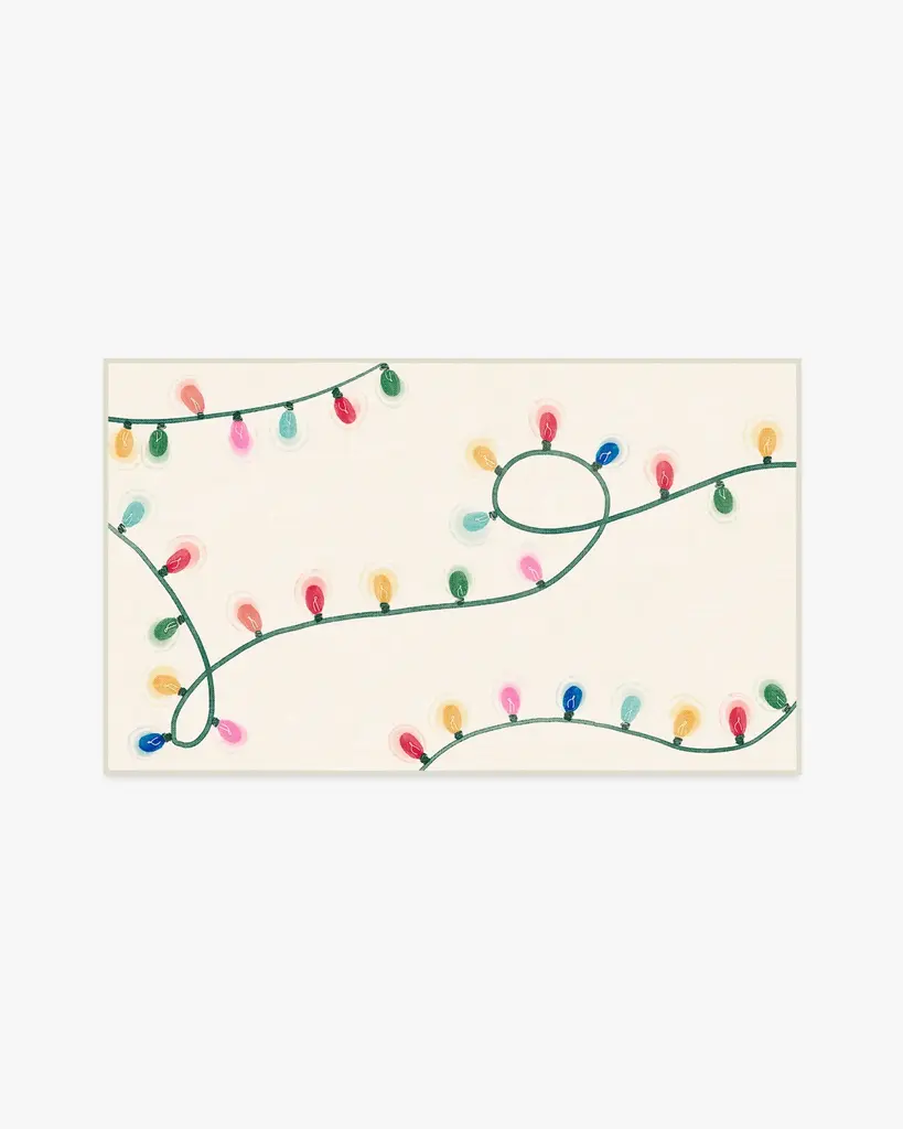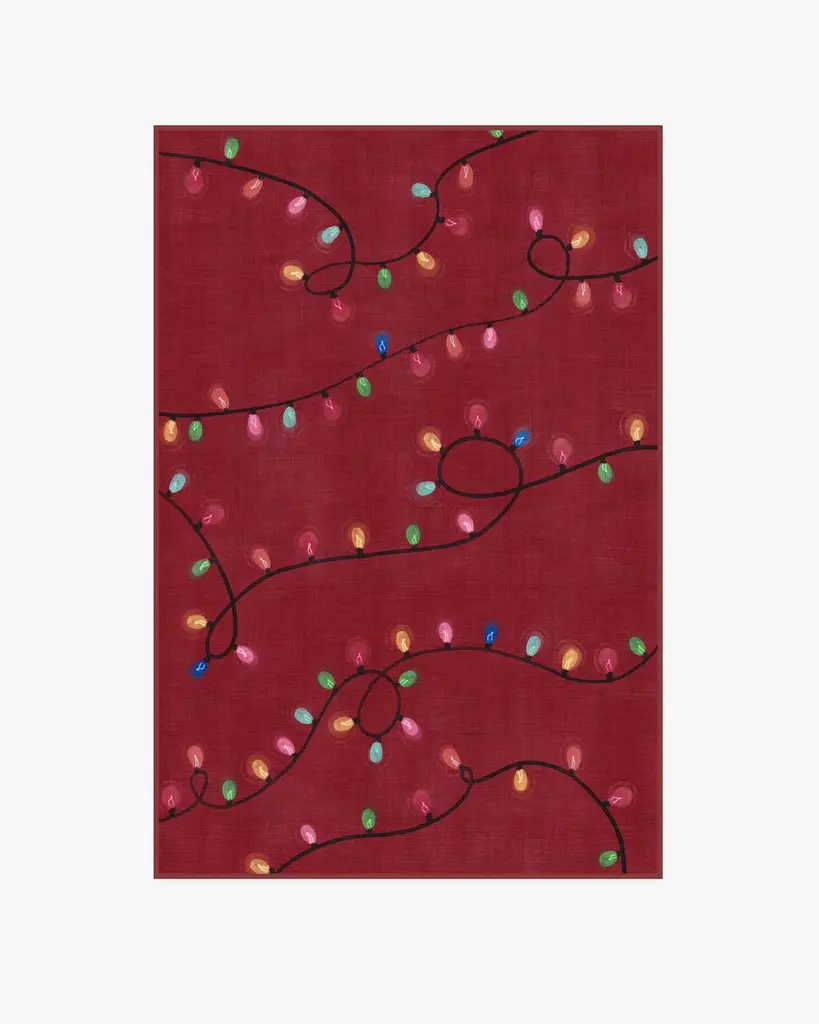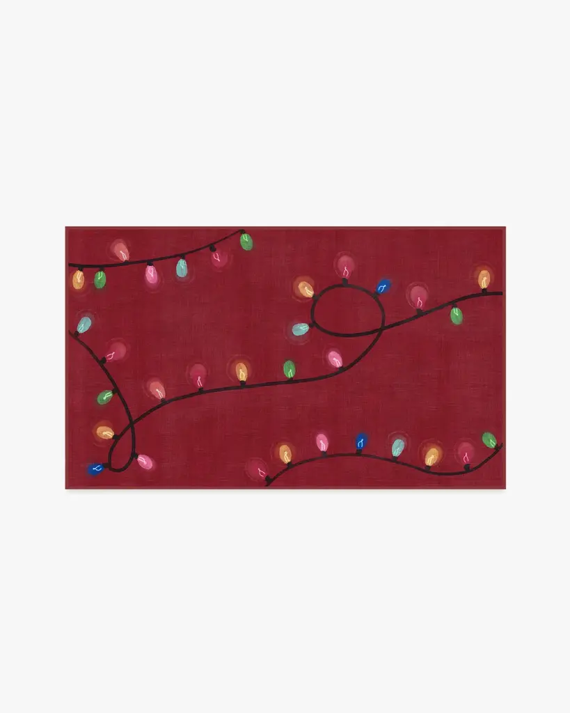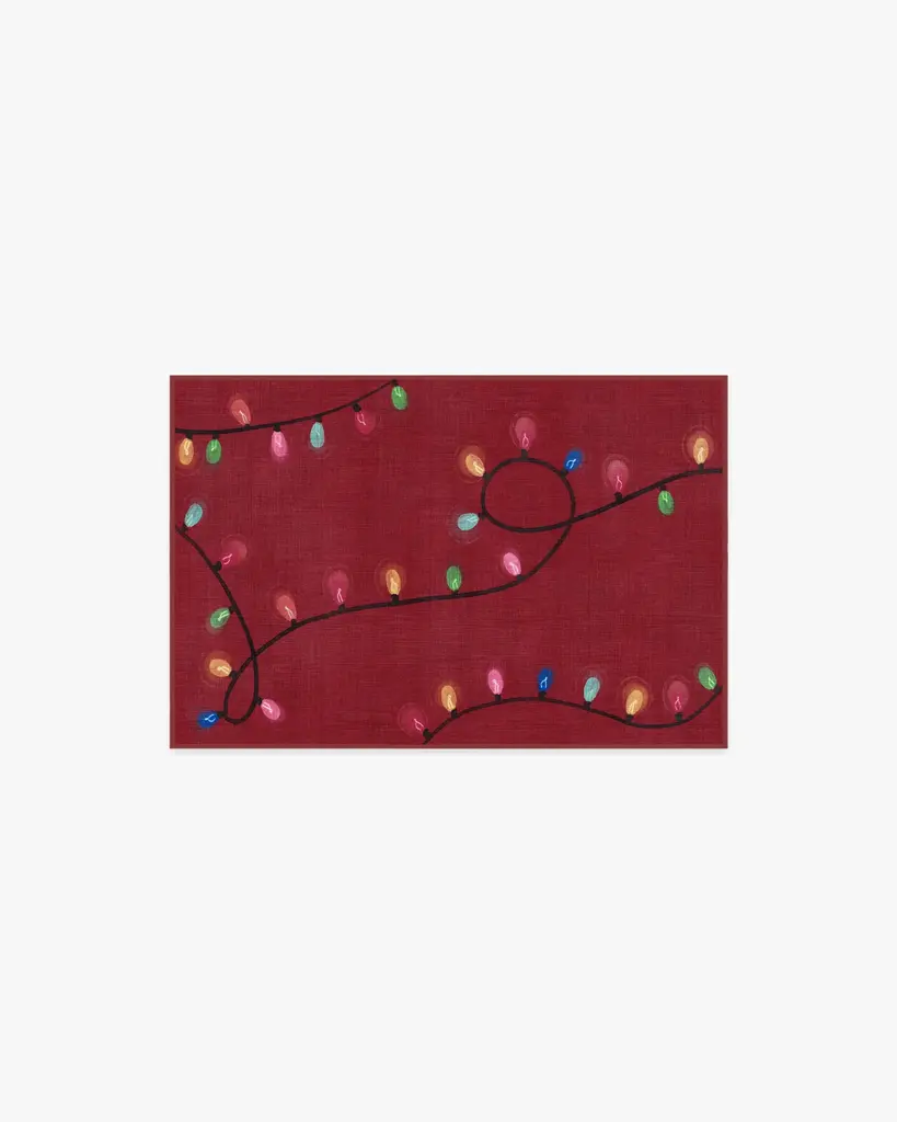 Glow big or go home. The Let It Glow Red Rug sets a warm tone for the holidays with its rich burgundy backdrop and decorative tangle of twinkling lights. Bursts of red, yellow, green, and soft blues and pinks add a colorful sparkle that’s all joy, no fuss. A shiny season is afoot. Water-resistant, stain-resistant, and machine-washable. Colors may vary by device and lighting.
