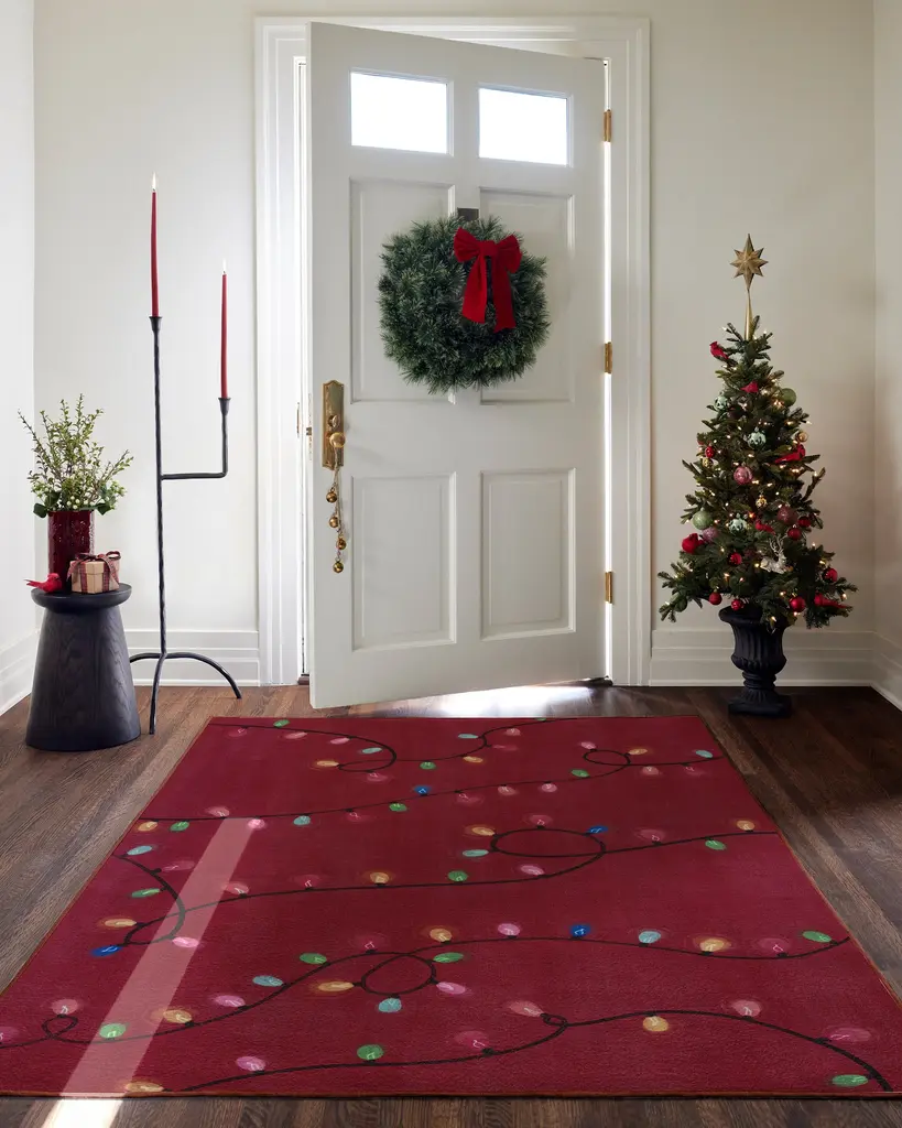 Glow big or go home. The Let It Glow Red Rug sets a warm tone for the holidays with its rich burgundy backdrop and decorative tangle of twinkling lights. Bursts of red, yellow, green, and soft blues and pinks add a colorful sparkle that’s all joy, no fuss. A shiny season is afoot. Water-resistant, stain-resistant, and machine-washable. Colors may vary by device and lighting.