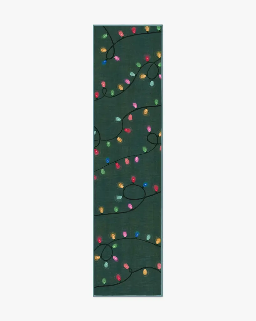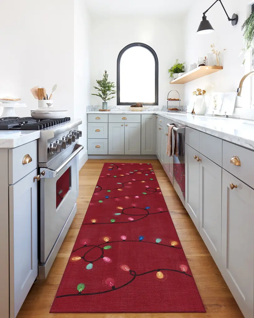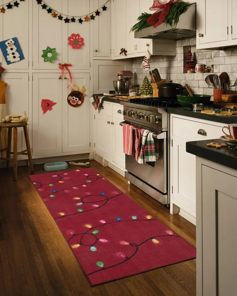Glow big or go home. The Let It Glow Red Rug sets a warm tone for the holidays with its rich burgundy backdrop and decorative tangle of twinkling lights. Bursts of red, yellow, green, and soft blues and pinks add a colorful sparkle that’s all joy, no fuss. A shiny season is afoot. Water-resistant, stain-resistant, and machine-washable. Colors may vary by device and lighting.