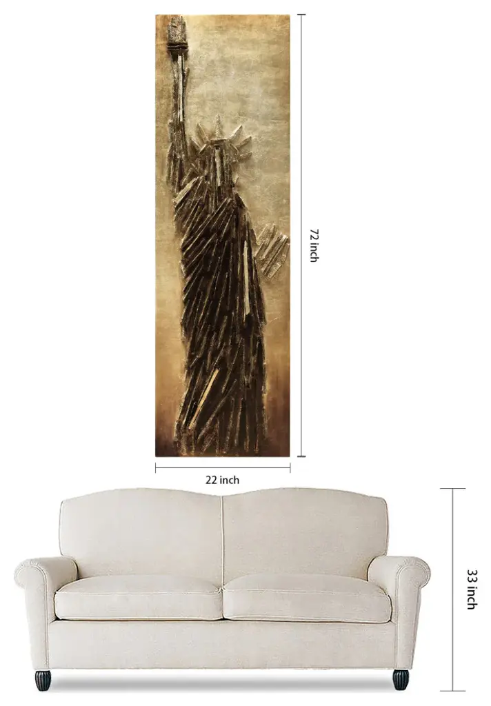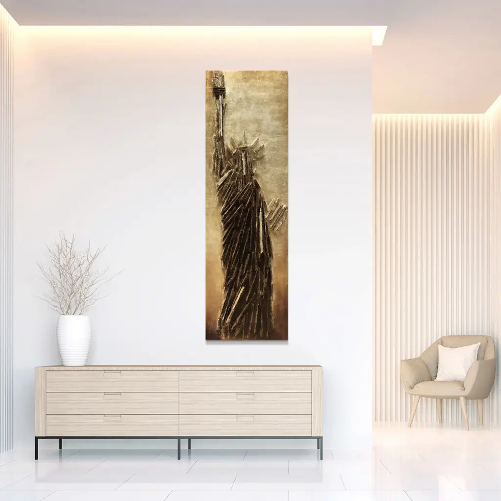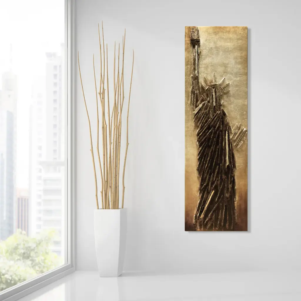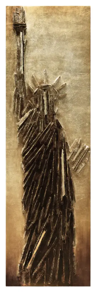 Reproduced in wood sculpture, this image of the Statue of Liberty is both iconic and surprising. The stance of Lady Liberty is unmistakable, with her torch held aloft and her spiked crown, but this representation through strips of resin changes the classic image. Instead, she seems a colossus or a form hewn from the earth. The use of spaces allows the statue to cast a reflection of the background"™s light.