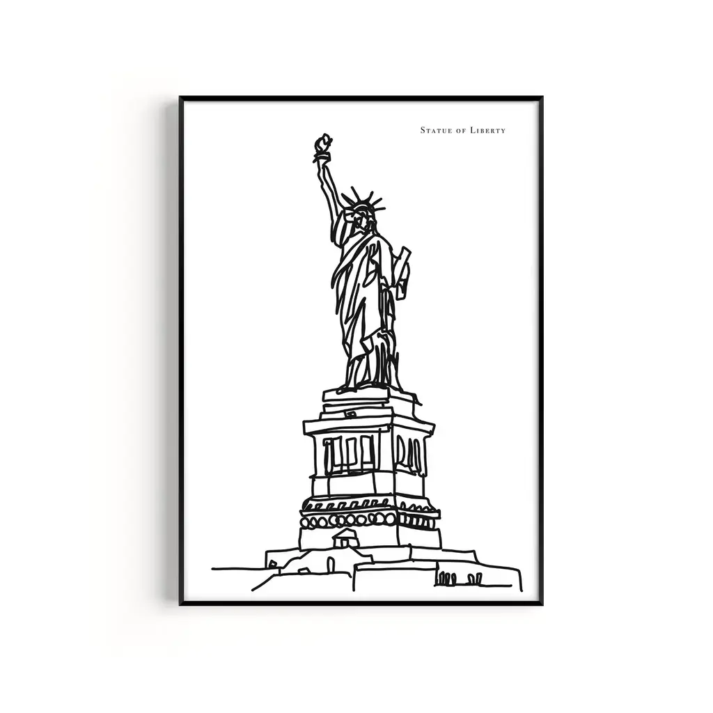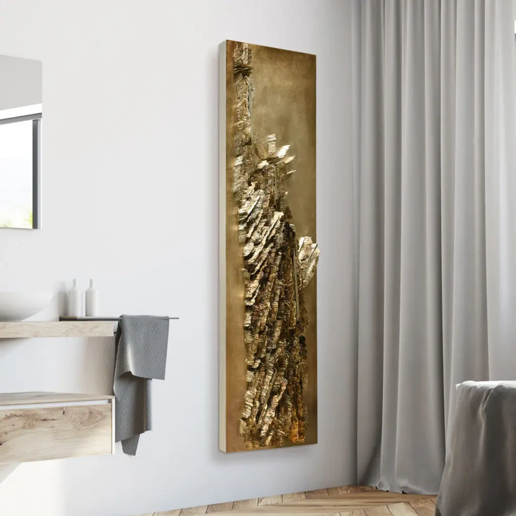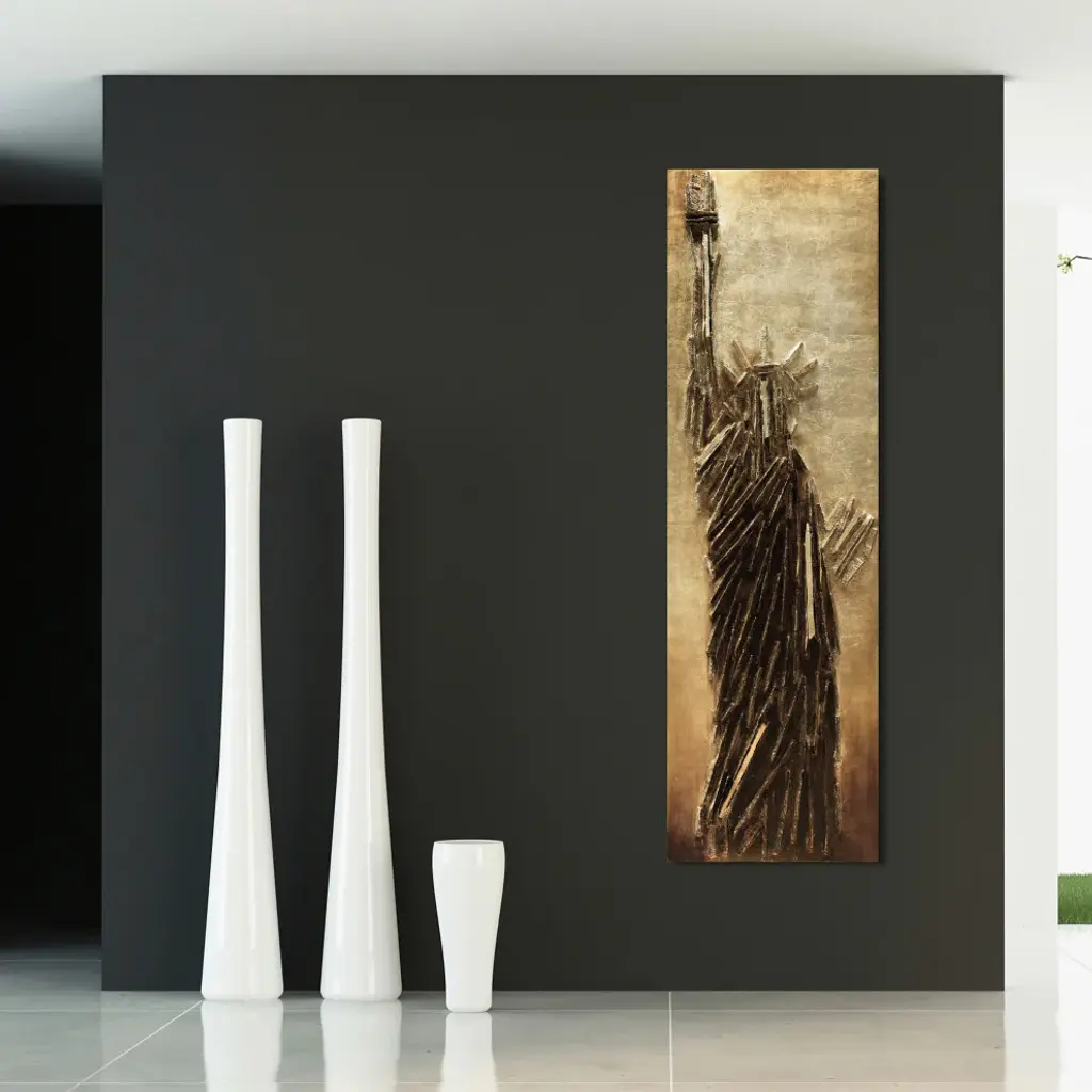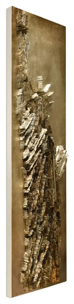 Reproduced in wood sculpture, this image of the Statue of Liberty is both iconic and surprising. The stance of Lady Liberty is unmistakable, with her torch held aloft and her spiked crown, but this representation through strips of resin changes the classic image. Instead, she seems a colossus or a form hewn from the earth. The use of spaces allows the statue to cast a reflection of the background"™s light.