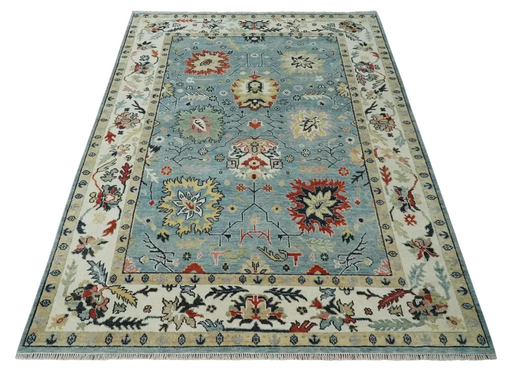 This Light Blue and Ivory hand knotted Traditional Oushak Wool Area Rug offers a unique blend of vibrant colors and soft wool for a timeless look. Hand crafted with attention to detail, this rug brings traditional style to any space. Perfect for a living room, entryway, or bedroom. Hand-Knotted SIZES ARE MADE TO ORDER IN 30-45 DAYS Made with Wool Color : Light Blue and Ivory Made with 28 knots per square inch Made in India USERS GUIDE Avoid prolonged moisture Vacuum regularly and/or shake to remove dust Do not pull any loose threads. Use scissors to simply cut the ends The blot spills immediately with a white cloth. Harsh chemicals may damage or fade the rug Use rug protectors under heavy furniture