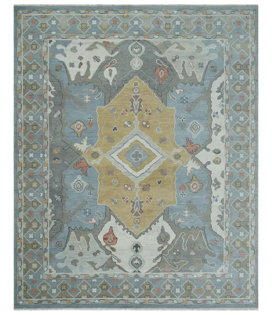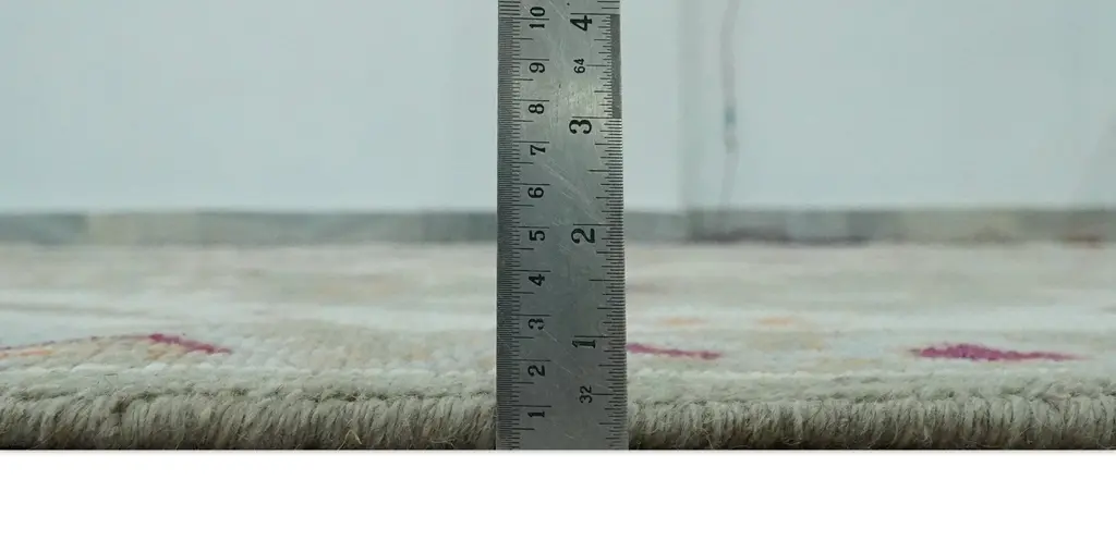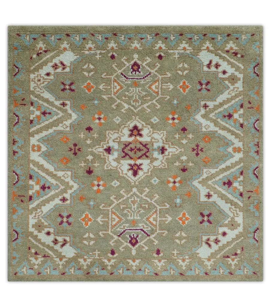 This exquisite rug boasts a sophisticated blend of muted greens and earth tones, accentuated by vibrant splashes of orange and purple. The intricate geometric motifs are inspired by traditional tribal patterns, evoking a sense of rich cultural heritage. The soft, plush texture invites luxury underfoot, while the symmetrical design adds elegance and balance. Ideal for upscale interiors, this rug seamlessly merges timeless artistry with modern style, making it a standout decor piece. Product Details Color: Light Green, Ivory and Maroon Design: Traditional Material: Wool Construction: Hand-Knotted Knots Per Inch (KPI): Availability: Made to Order in 30-45 Days Care Guide Keep dry and well-ventilated Clean dust by vacuuming or shaking outdoors Cut loose threads with scissors - never pull them Dab spills with clean white cloth; avoid strong cleaning products Place protective pads under furniture legs