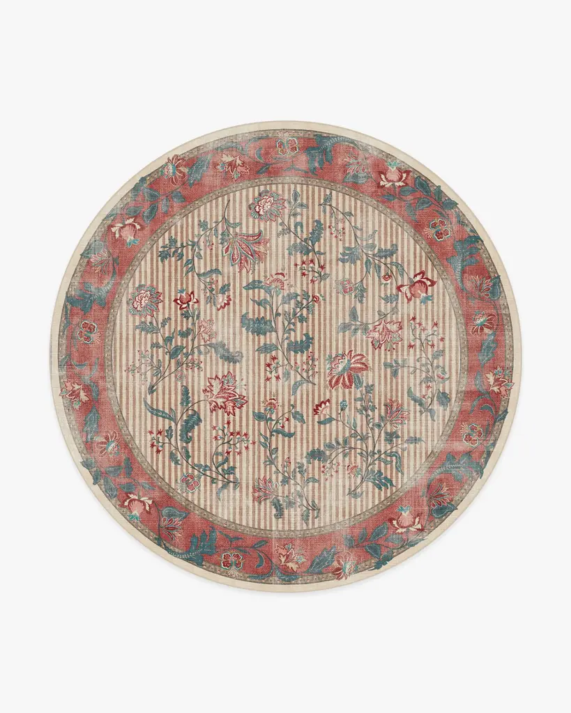 Inspired by Indian and French foulard prints, our Lilou Currant & Teal Green Rug features flowing bouquets set against a striped background, bordered by wavy florals. A palette of pinks, red, teal, ivory, and neutral tones adds a balance of color and depth. Water-resistant, stain-resistant, and machine-washable. Rug colors may vary slightly according to your device and the lighting in your space.