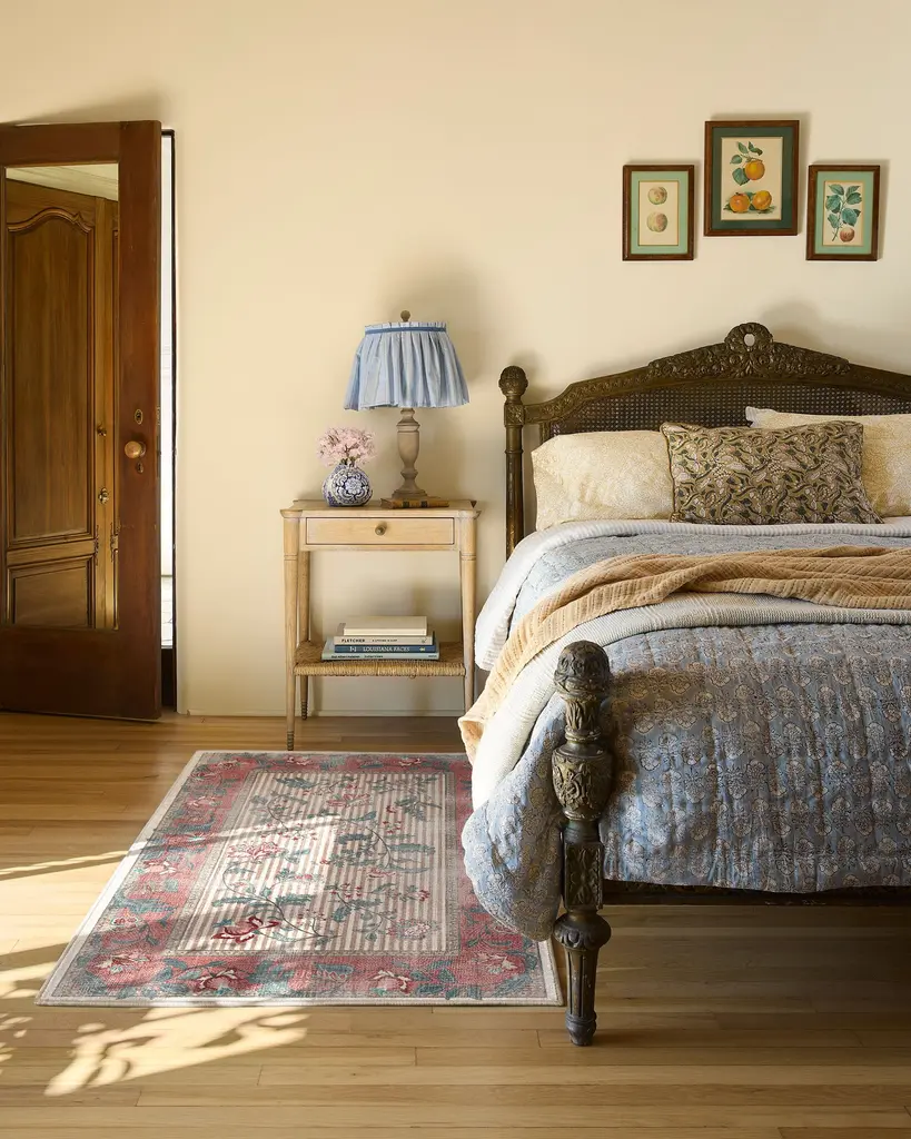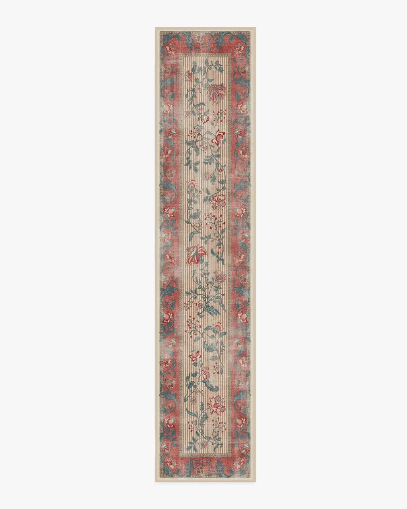 Inspired by Indian and French foulard prints, our Lilou Currant & Teal Green Rug features flowing bouquets set against a striped background, bordered by wavy florals. A palette of pinks, red, teal, ivory, and neutral tones adds a balance of color and depth. Water-resistant, stain-resistant, and machine-washable. Rug colors may vary slightly according to your device and the lighting in your space.