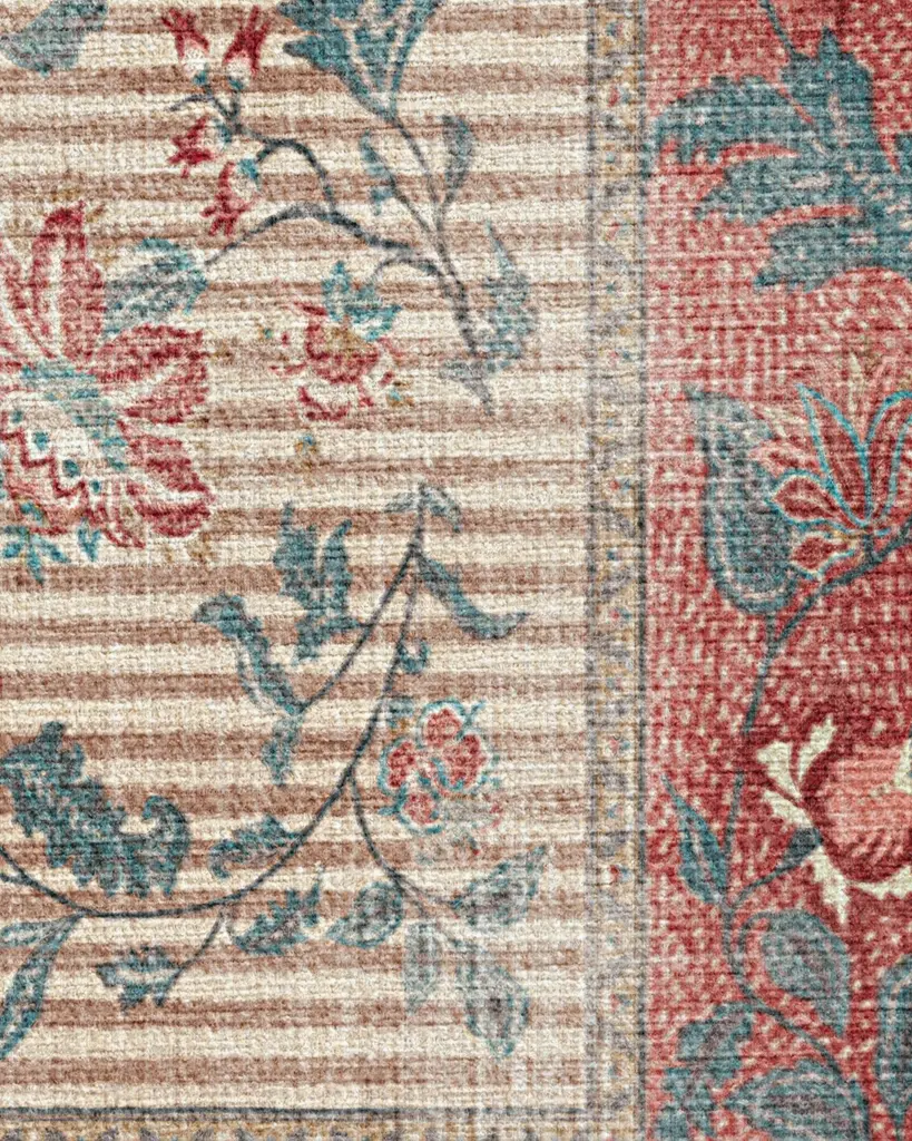Inspired by Indian and French foulard prints, our Lilou Currant & Teal Green Rug features flowing bouquets set against a striped background, bordered by wavy florals. A palette of pinks, red, teal, ivory, and neutral tones adds a balance of color and depth. Water-resistant, stain-resistant, and machine-washable. Rug colors may vary slightly according to your device and the lighting in your space.