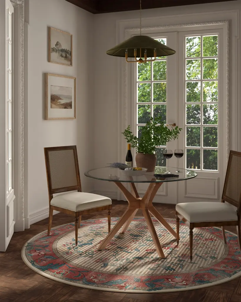 Inspired by Indian and French foulard prints, our Lilou Currant & Teal Green Rug features flowing bouquets set against a striped background, bordered by wavy florals. A palette of pinks, red, teal, ivory, and neutral tones adds a balance of color and depth. Water-resistant, stain-resistant, and machine-washable. Rug colors may vary slightly according to your device and the lighting in your space.