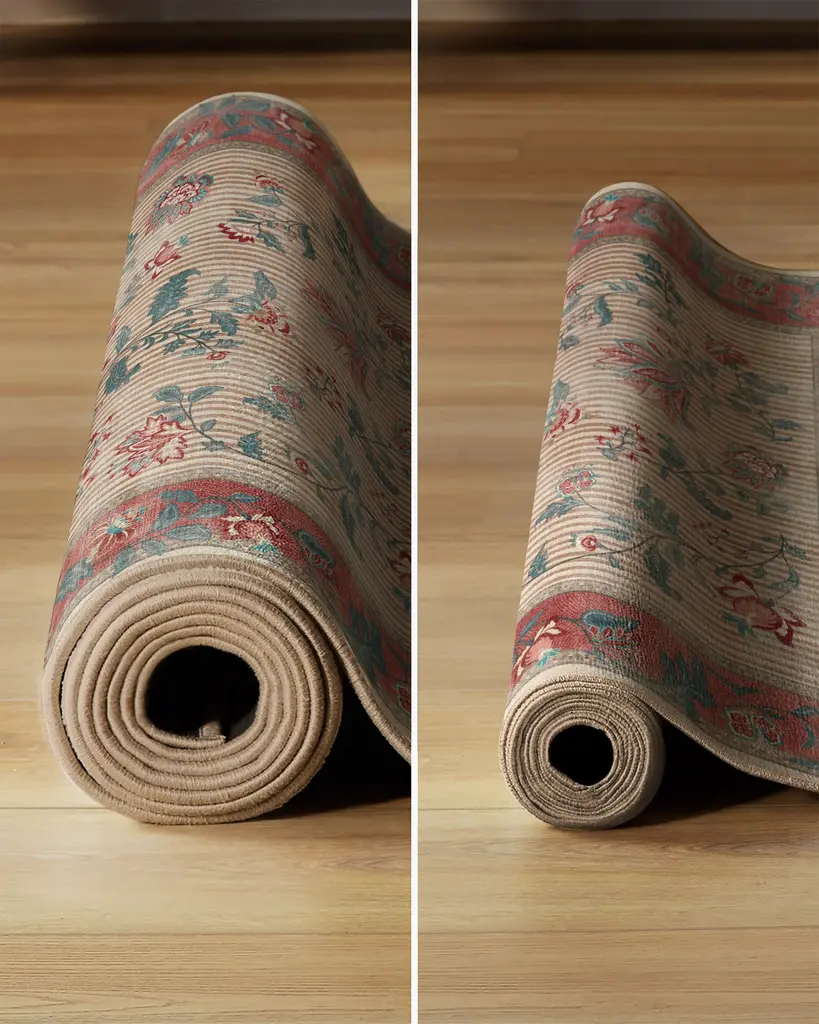 Inspired by Indian and French foulard prints, our Lilou Currant & Teal Green Rug features flowing bouquets set against a striped background, bordered by wavy florals. A palette of pinks, red, teal, ivory, and neutral tones adds a balance of color and depth. Water-resistant, stain-resistant, and machine-washable. Rug colors may vary slightly according to your device and the lighting in your space.