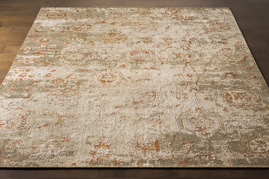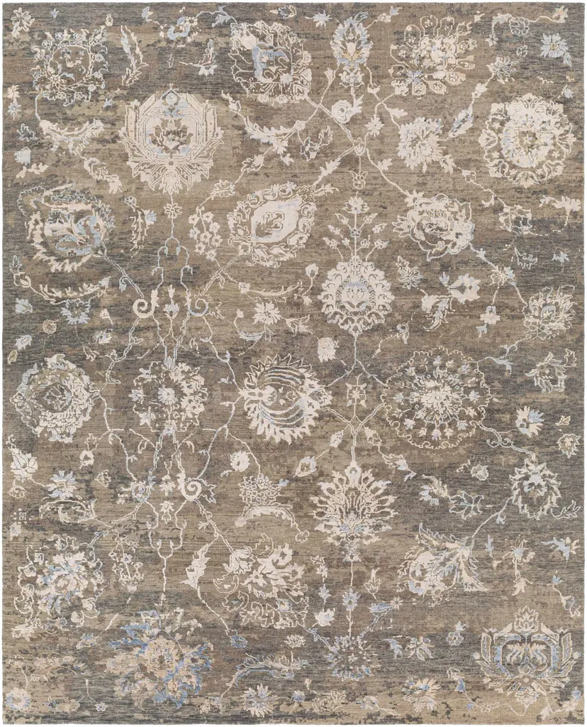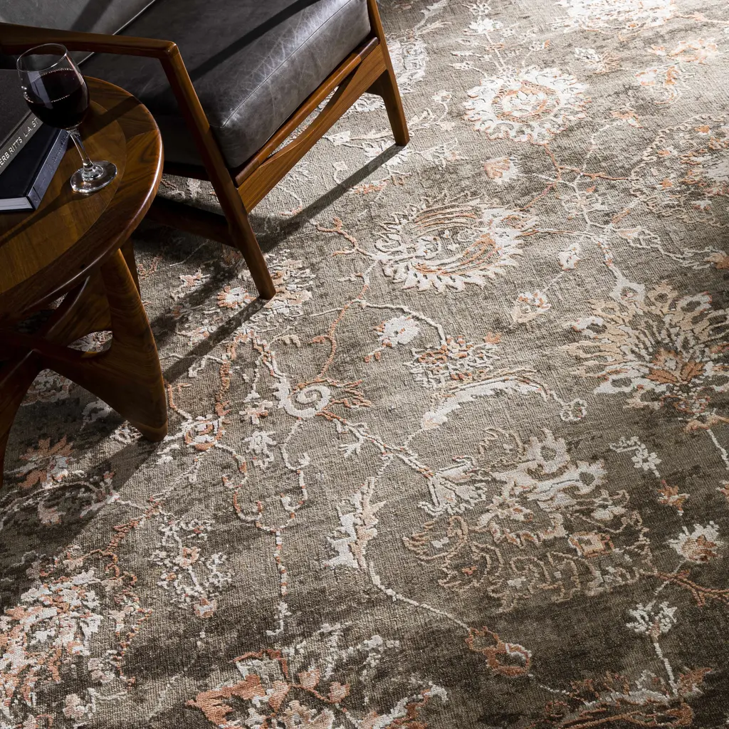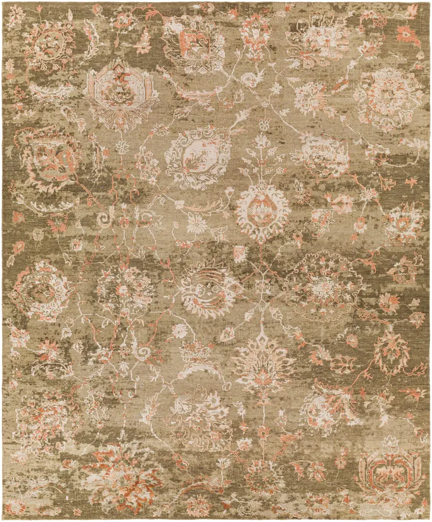 Collection: Limay Colors: Olive, Taupe, Dusty Coral, Tan, Brick Red, Peach Construction: Hand Knotted Material: 70% Wool, 30% Viscose Pile: High Pile Pile Height: 0.98" Styles: Traditional Made In: India Thickness: 1.18" Price Range: $$$$$ (Premium)