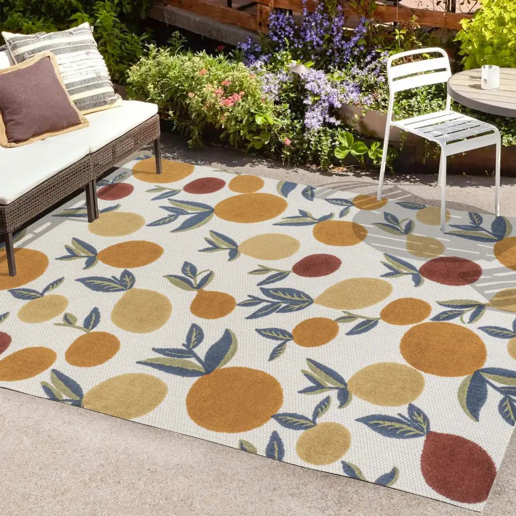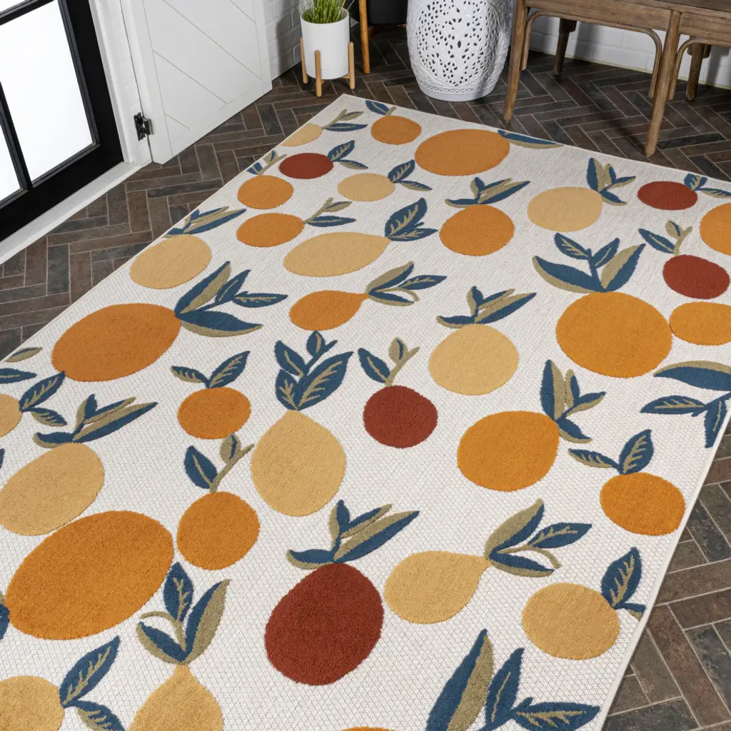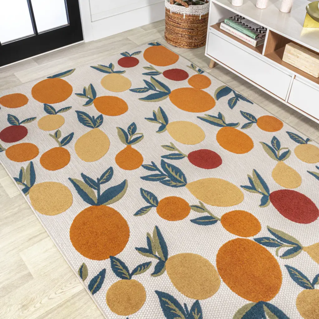Scattered lemons and leaves add sunny Mediterranean style to your home, updated with modern flair. Our graphic rug will add a bold pop of pattern and color to the living room, dining room, bedroom or office. Perfect for the porch, this pet-friendly and low-pile design is easy to clean.Features:• Power loomed from durable synthetic fibers, with a short 0.2" pile • Rust-red, orange and green add bold color against an ivory background• Made from easy-care polypropylene - just sweep, vacuum or hose down with mild soap and water• 100% Polypropylene• No backing, use of rug pad is recommended (sold separately)• Power Loomed in Turkey• Actual Dimension: 5 ft. 3 in. x 7 ft. 7 in.• Color: Orange/Beige/Cream• Thickness measures: 0.2 in.• Available in multiple sizes and/or colorsRug Care:• Vacuum regularly and spot clean as needed; avoid direct and continuous exposure to sunlight; use brushless vacuum; remove spills immediately; if liquid, blot with clean, undyed cloth by pressing firmly around the spill to absorb as much as possible; for hard to remove stains, professional rug cleaning is recommended; store in a dry, well ventilated area and rotate for consistent wear• Packing and shipping may cause temporary creases in rugs, which will flatten out after a week on the floor; to expedite the process, try back-rolling your rug before laying it down, and then allow ample time for the remaining creases to relax• Please Note: Due to differences in monitors, some rug colors may vary slightly. Lengths and widths may vary from the published dimensions. Patterns may vary slightly according to shape and size selected.About us:Style your floors with JONATHAN Y. By combining fine craftsmanship and design, this New York creative studio is bringing fashion to your floors. The collection mixes sustainable organic materials, vibrant colors and trend worthy styles to create JONATHAN Y''s distinctive catalog of rugs.