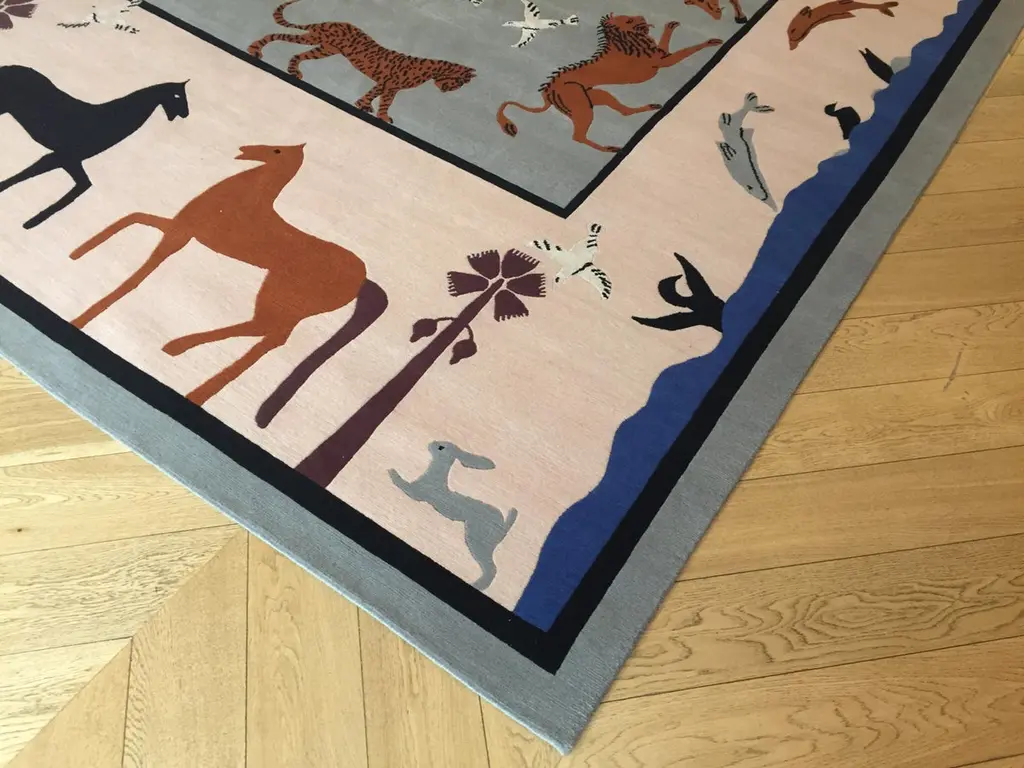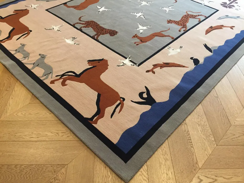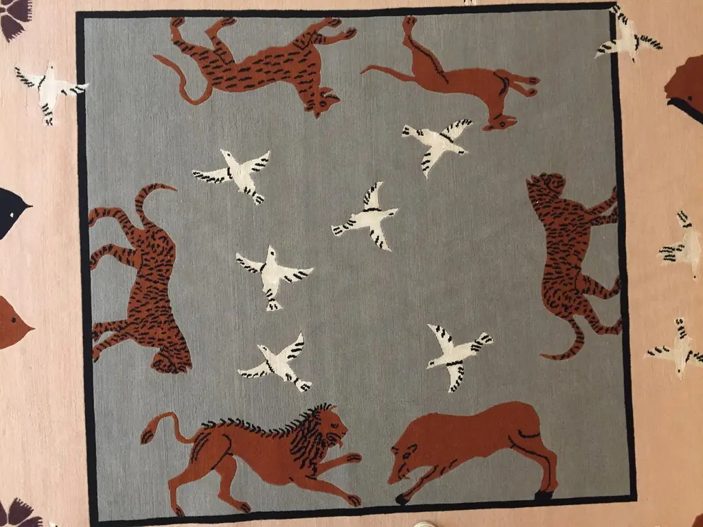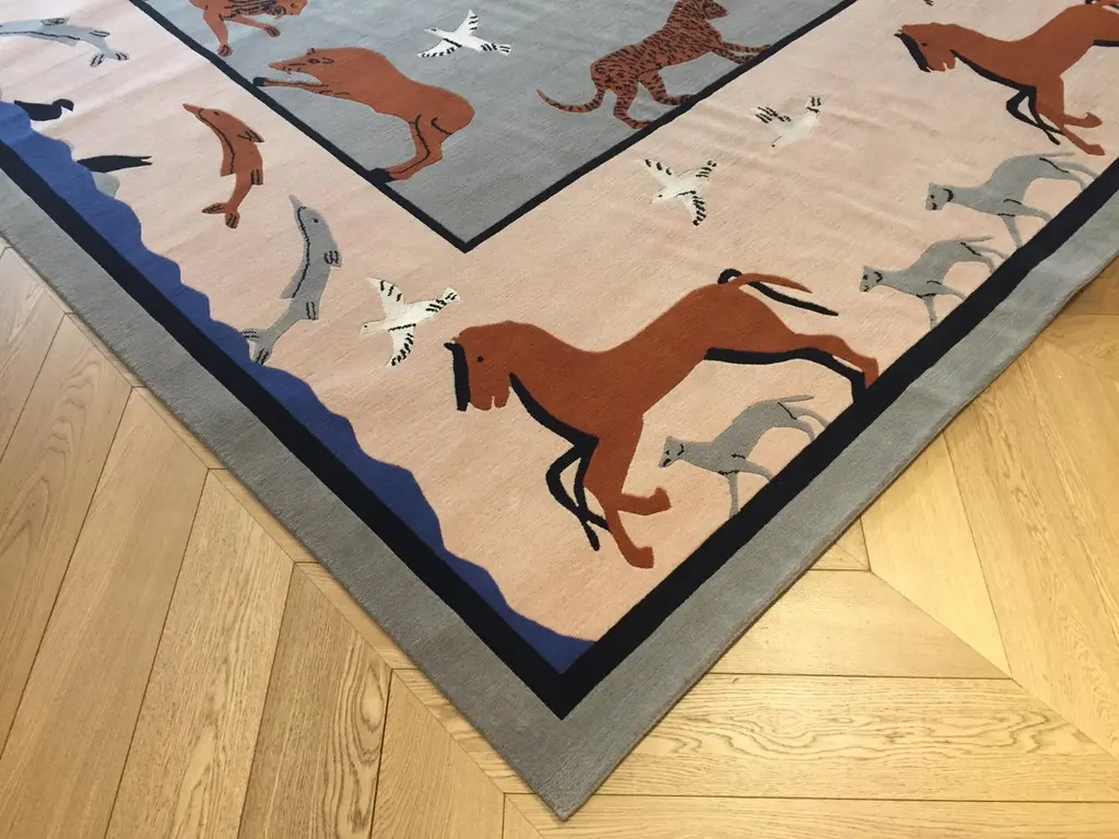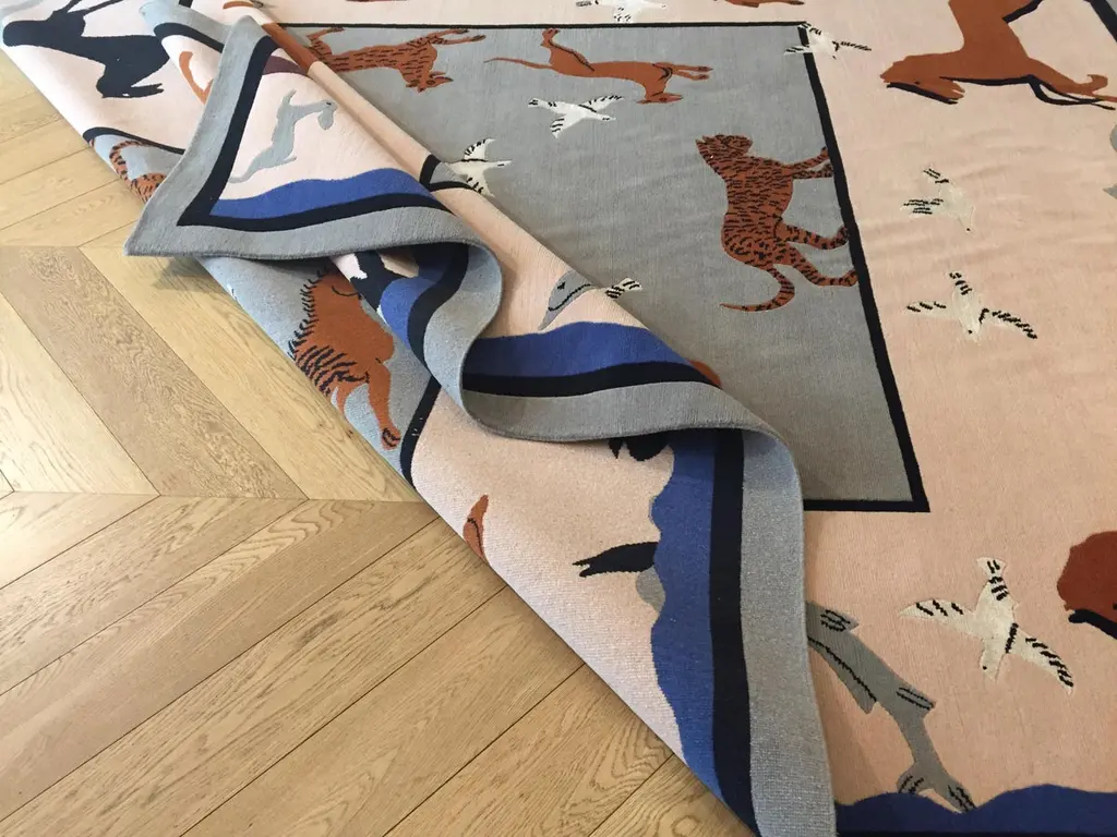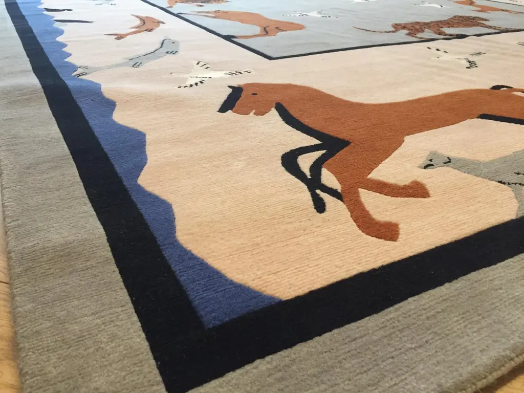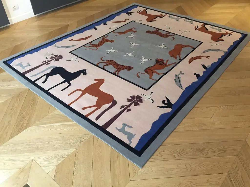 Handmade rug in Nepal based on a design by Linde Burkhardt. This rug is part of the collection "Dalle Gioie degli Etruschi" made exclusively for the Boralevi Gallery in Florence. This carpet, like the others in the series, wants to be a sort of homage to a culture that is at the base of the style of decorations throughout the West.The fauna of the Etruscan era is present in almost all the artistic testimonies we received. In addition to the animals that were part of their daily life, the Etruscans had a particular preference for the not really realistic representations of those animals, which had no way of meeting in the woods of the house, but which testify to the influence of neighboring peoples.