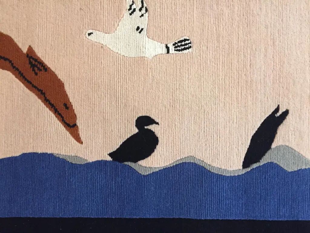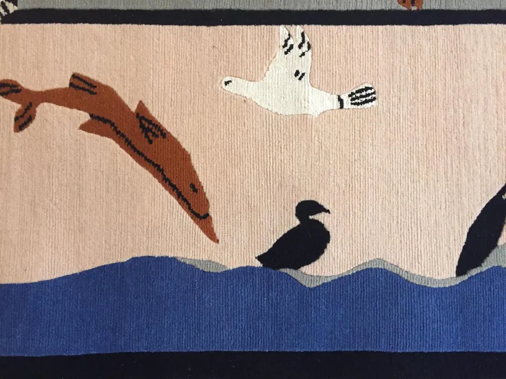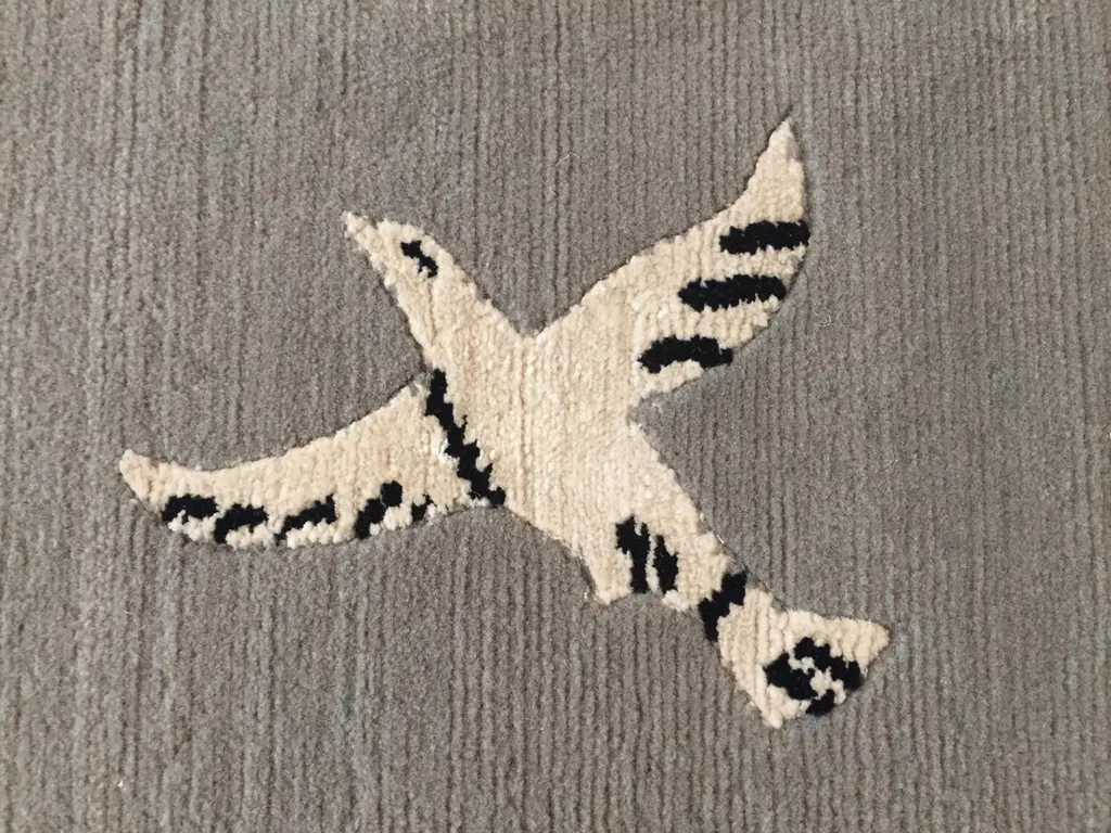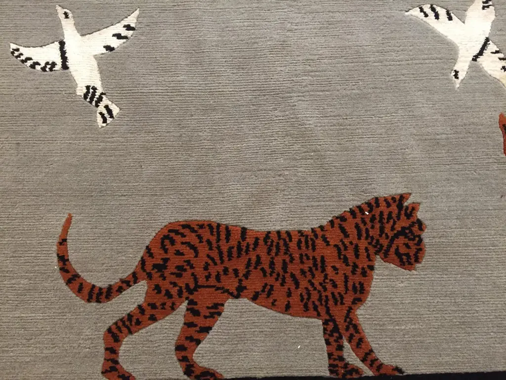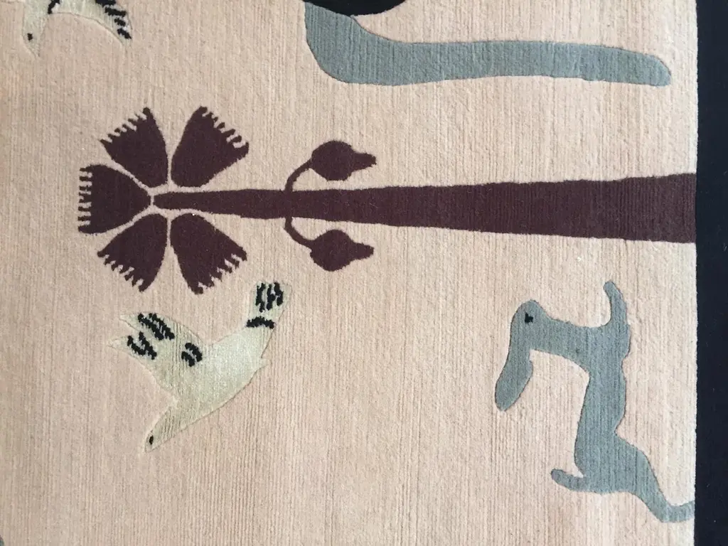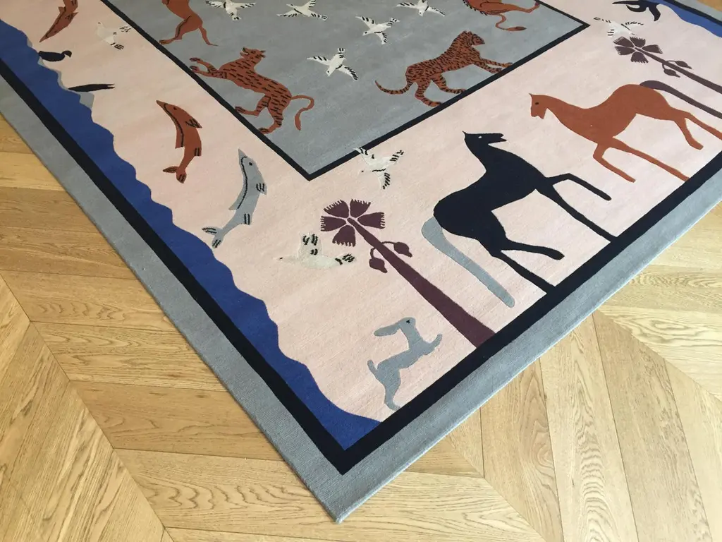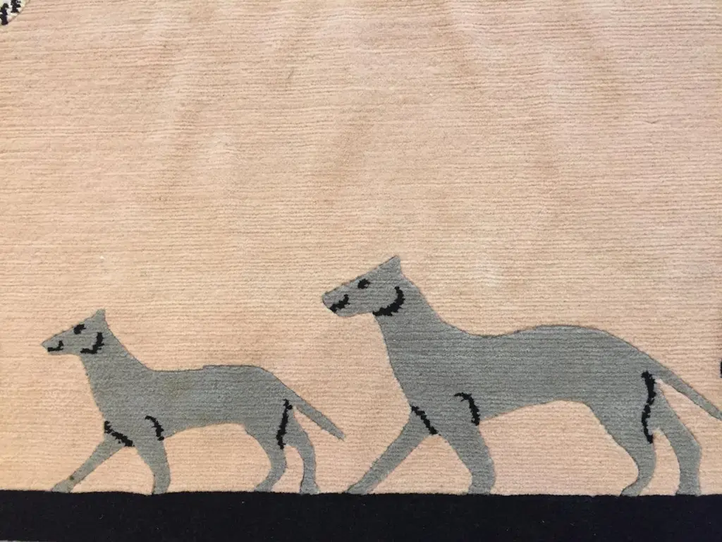 Handmade rug in Nepal based on a design by Linde Burkhardt. This rug is part of the collection "Dalle Gioie degli Etruschi" made exclusively for the Boralevi Gallery in Florence. This carpet, like the others in the series, wants to be a sort of homage to a culture that is at the base of the style of decorations throughout the West.The fauna of the Etruscan era is present in almost all the artistic testimonies we received. In addition to the animals that were part of their daily life, the Etruscans had a particular preference for the not really realistic representations of those animals, which had no way of meeting in the woods of the house, but which testify to the influence of neighboring peoples.