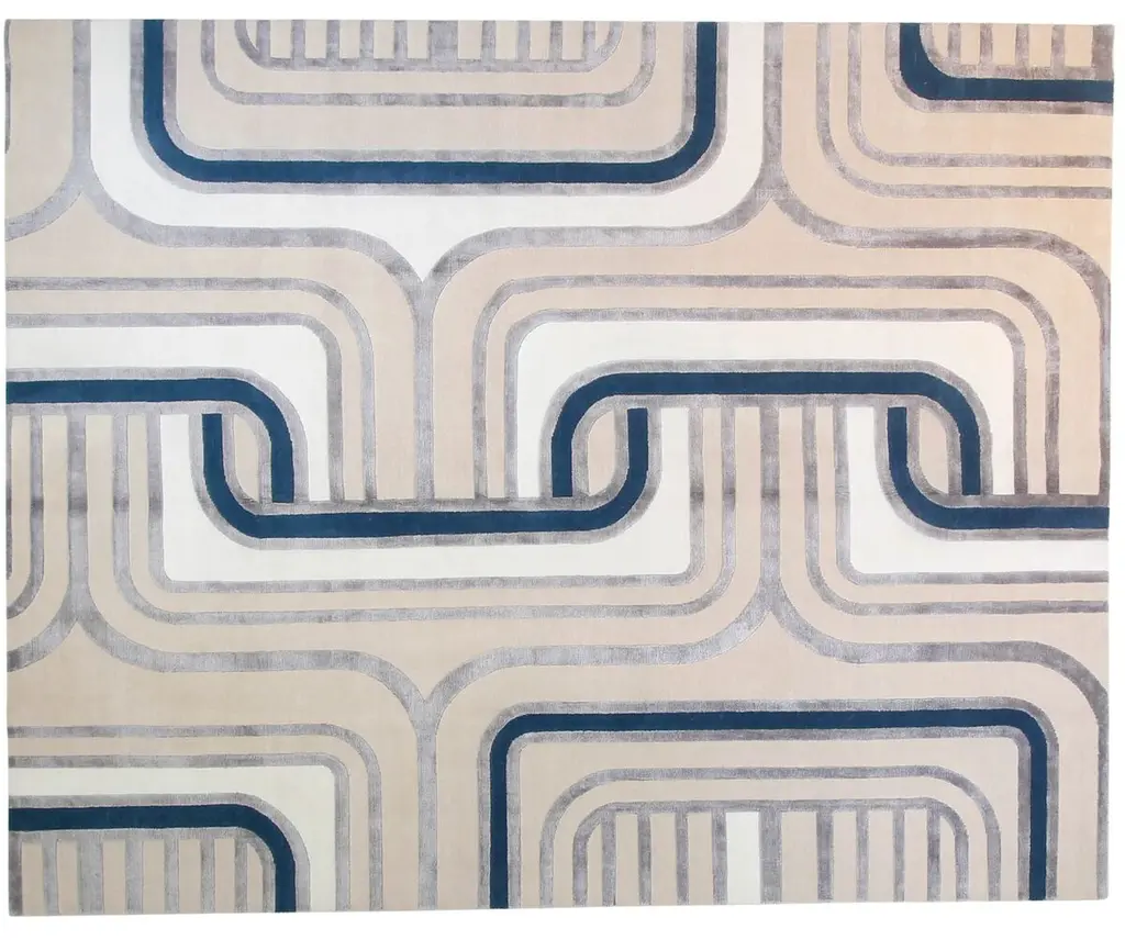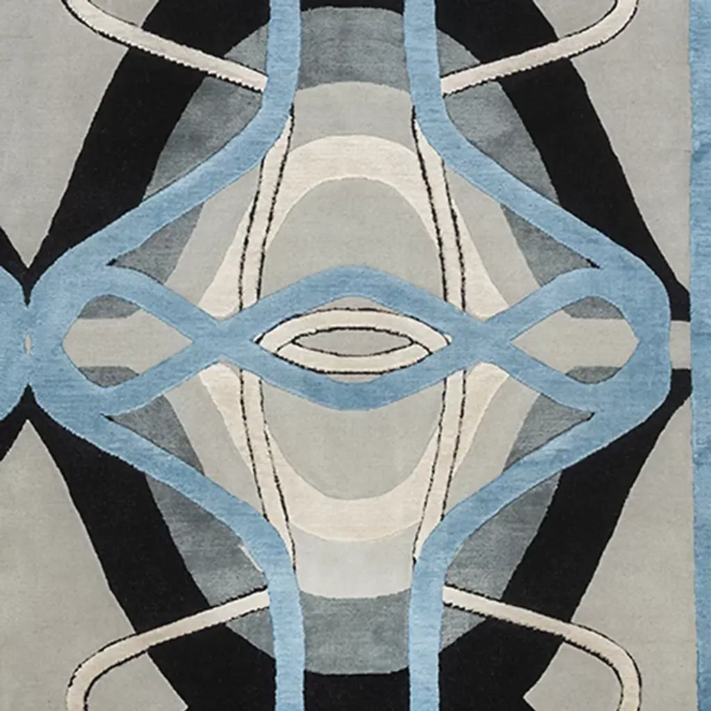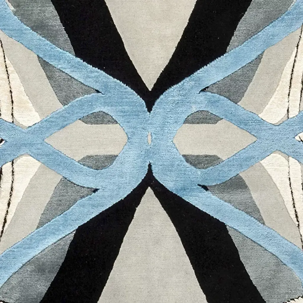 The Link Area Rug from Illulian presents a detailed and artistic appeal to its surroundings. This wool and silk blend is woven by hand in Nepal, putting an artisan spin on an already clever and captivating Karim Rashid design with an eye on vintage intricacy that uses pale blue details and framing to contrast with greyscale zones.