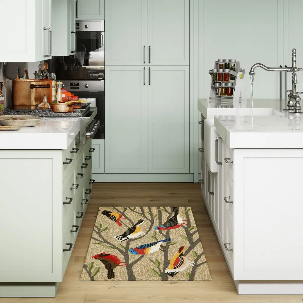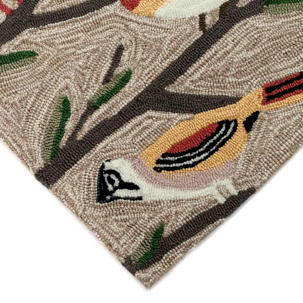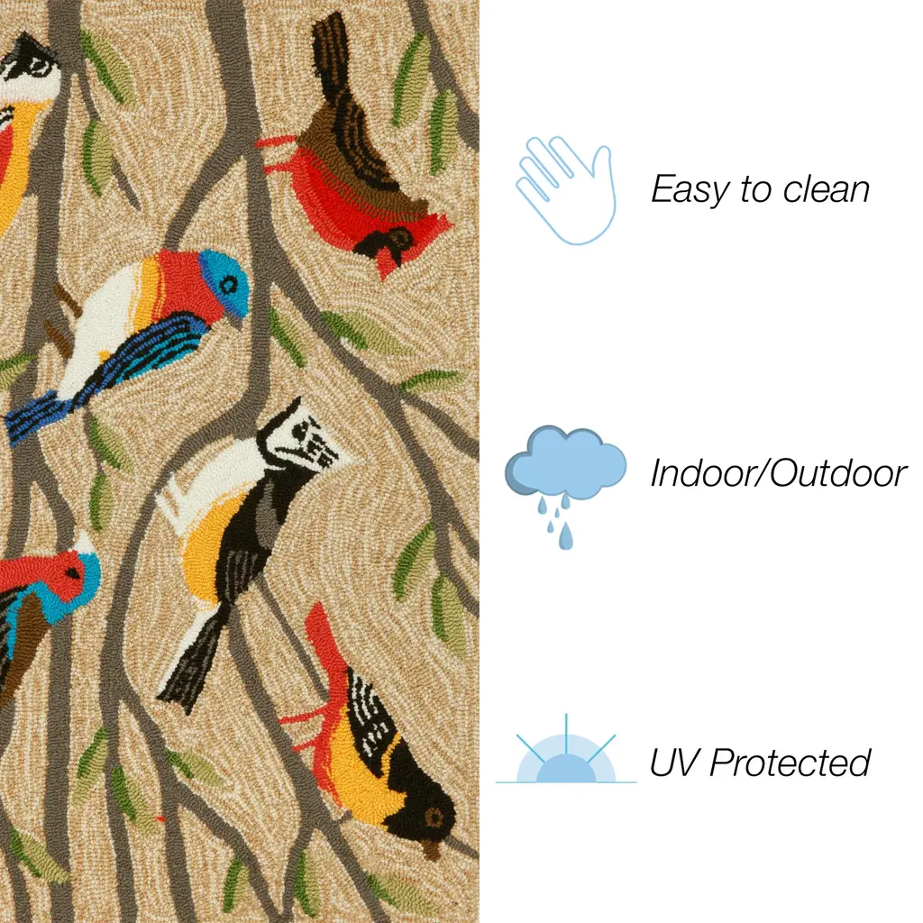 This Indoor/Outdoor Birds Rug has the beauty and softness of a traditional pile rug, but it's made of polyester and acrylic to stand up to high traffic indoors and out. The whimsical design of familiar backyard birds amid branches laden with leaves adds a delightful touch of outdoor style at any time of year.This handsome rug is versatile, colorful and functional. Durable enough to withstand heavy traffic, kids and pets, it's perfect for any area: porch, patio, sun room, kitchen and more. Hose clean.