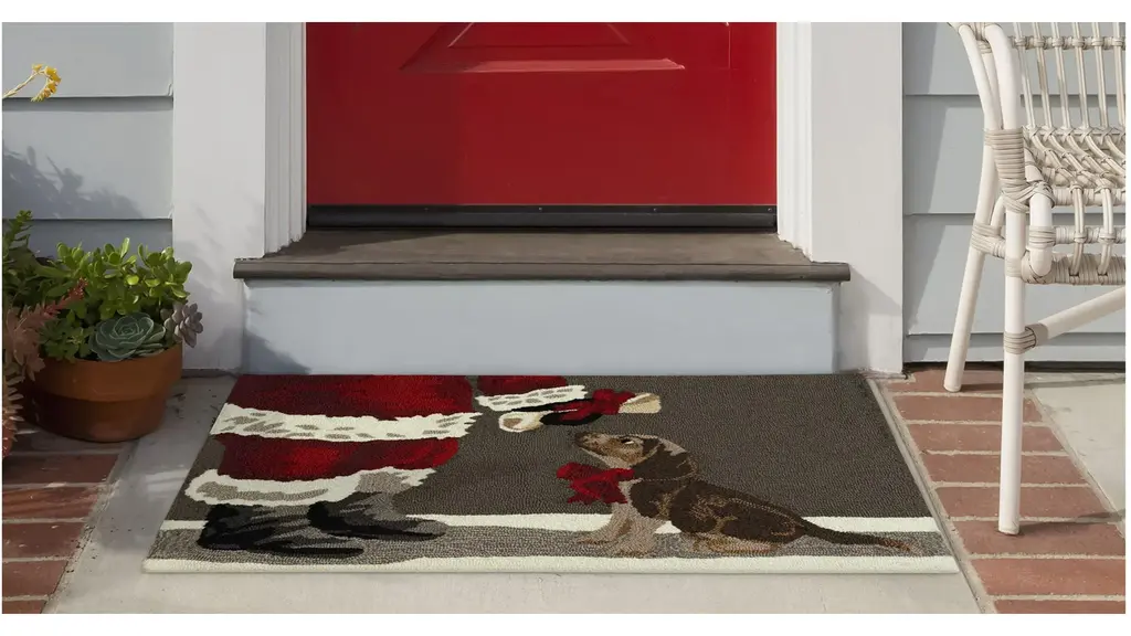 This hand hooked Liora Manne Frontporch Good Dog Indoor/Outdoor Rug features a whimsical holiday vignette. On a dark background accented in red and white, Santa Claus gifts a bone to an adorable puppy, presumably a Christmas gift for a lucky someone. This happy scene makes this mat the perfect accent to welcome guests at your door, at your kitchen sink, or in any space inside or outside your home. The material is hand hooked to create both softness and durability with weather resistant and added fade resistant treatment that is remarkably easy to clean. These pieces are perfect for you patio, entryway, bathroom, laundry room and kitchen making this the ideal indoor or outdoor rug. Limiting exposure to rain, moisture and direct sun will prolong rug life.