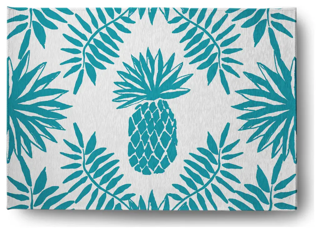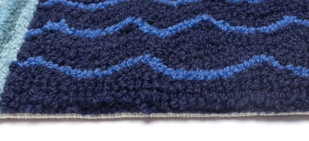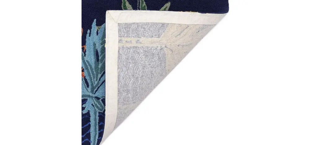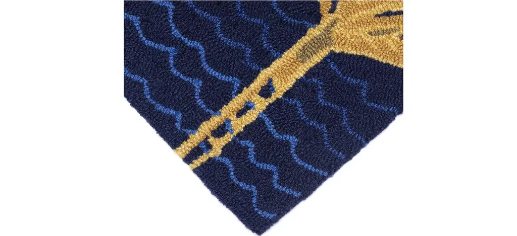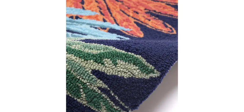 The Liora Manne Frontporch Palms Indoor/Outdoor Rug features a tropical seaside palm tree vignette. A navy blue background is accented with light blue waves and graphic palm trees in orange, aqua, green and golden yellow. This happy scene makes this mat the perfect accent to welcome guests at your door, at your kitchen sink, or in any space inside or outside your home. The material is hand hooked to create both softness and durability with weather resistant and added fade resistant treatment that is remarkably easy to clean. These pieces are perfect for you patio, entryway, bathroom, laundry room and kitchen making this the ideal indoor or outdoor rug. Limiting exposure to rain, moisture and direct sun will prolong rug life.